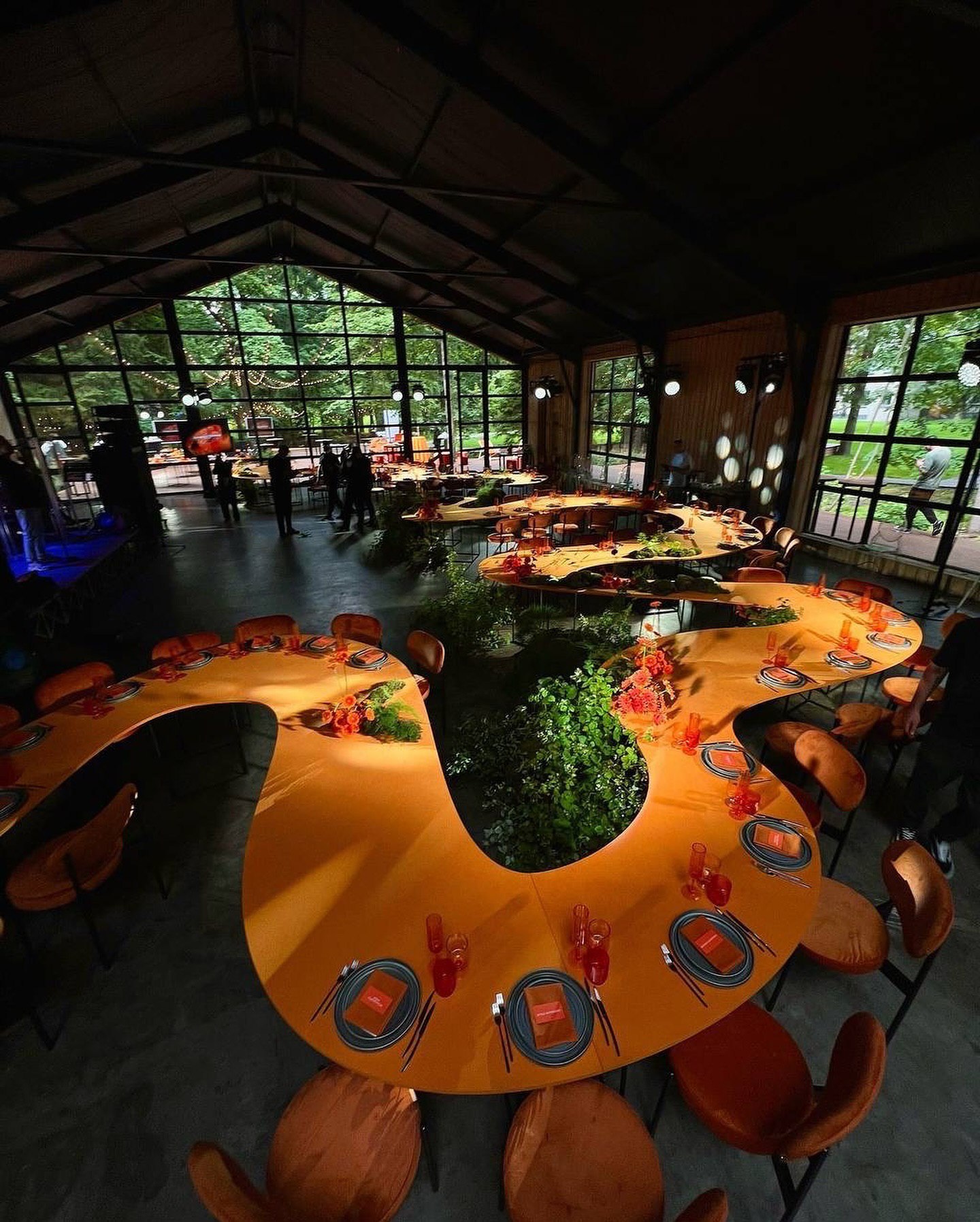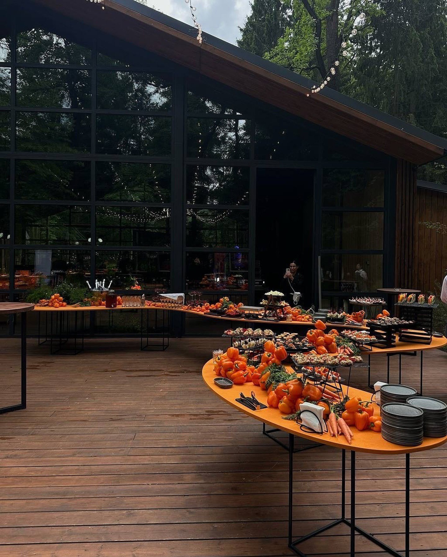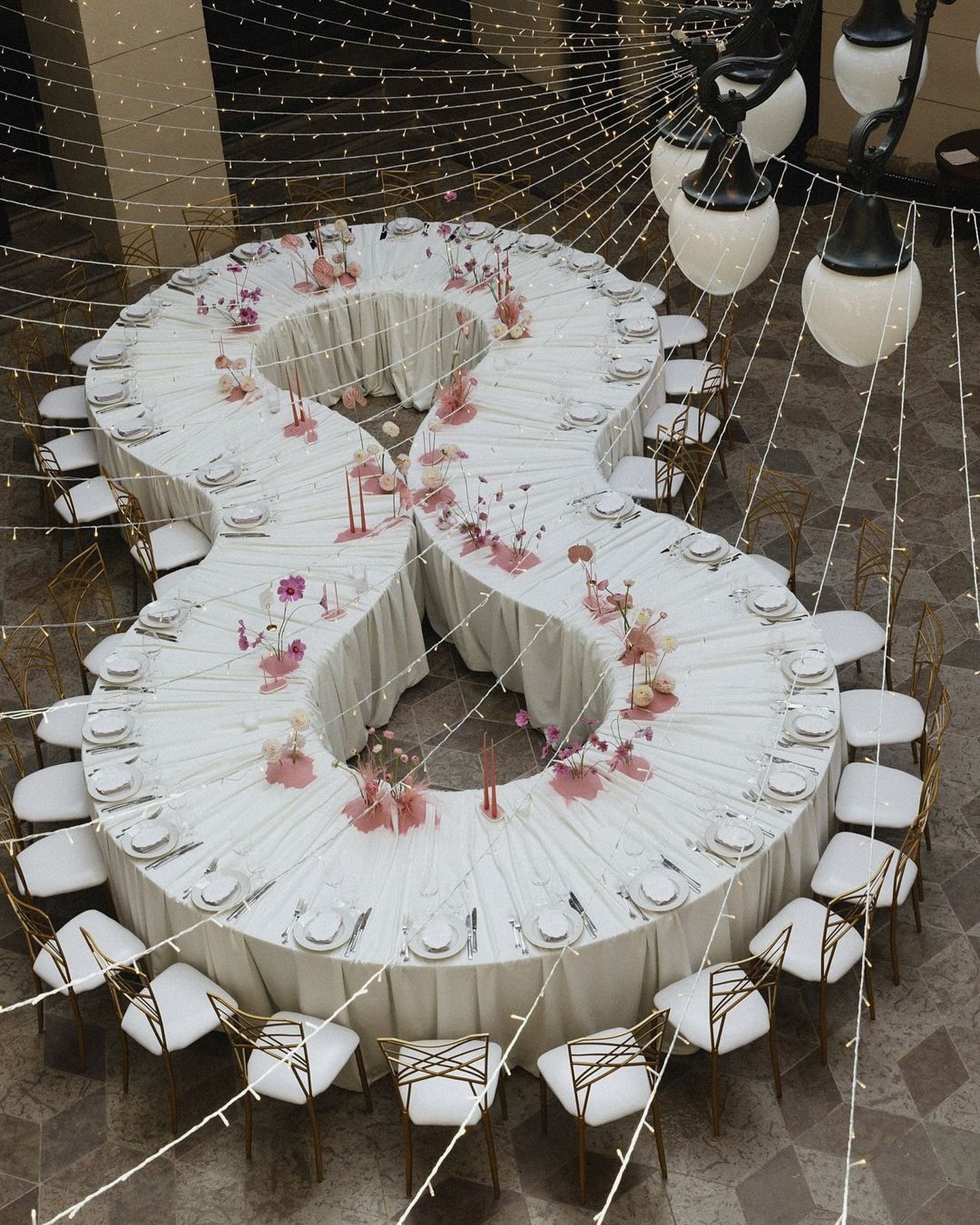 Зачастую расположение свадебных столов имеет очень ограниченное количество форм, поэтому сет-дизайн свадьбы со столами необычной формы точно произведет на гостей впечатление. Столы можно расположить в форме полукруга, знака бесконечности или «змейки» — такой прием вполне функционален, компактно расположить гостей с внешней части стола совершенно несложно.