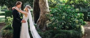 - Секунда до поцелуя: жених слегка наклоняет невесту, она обнимает его за шею.