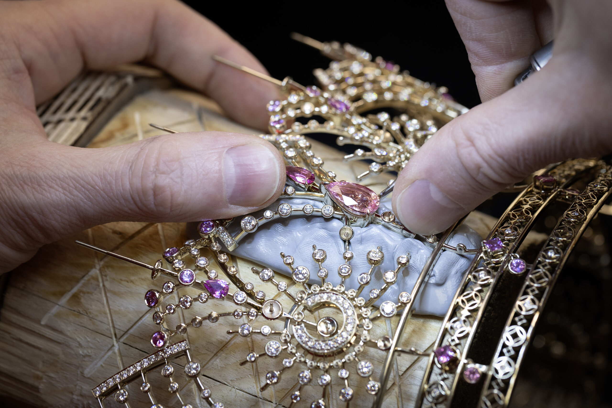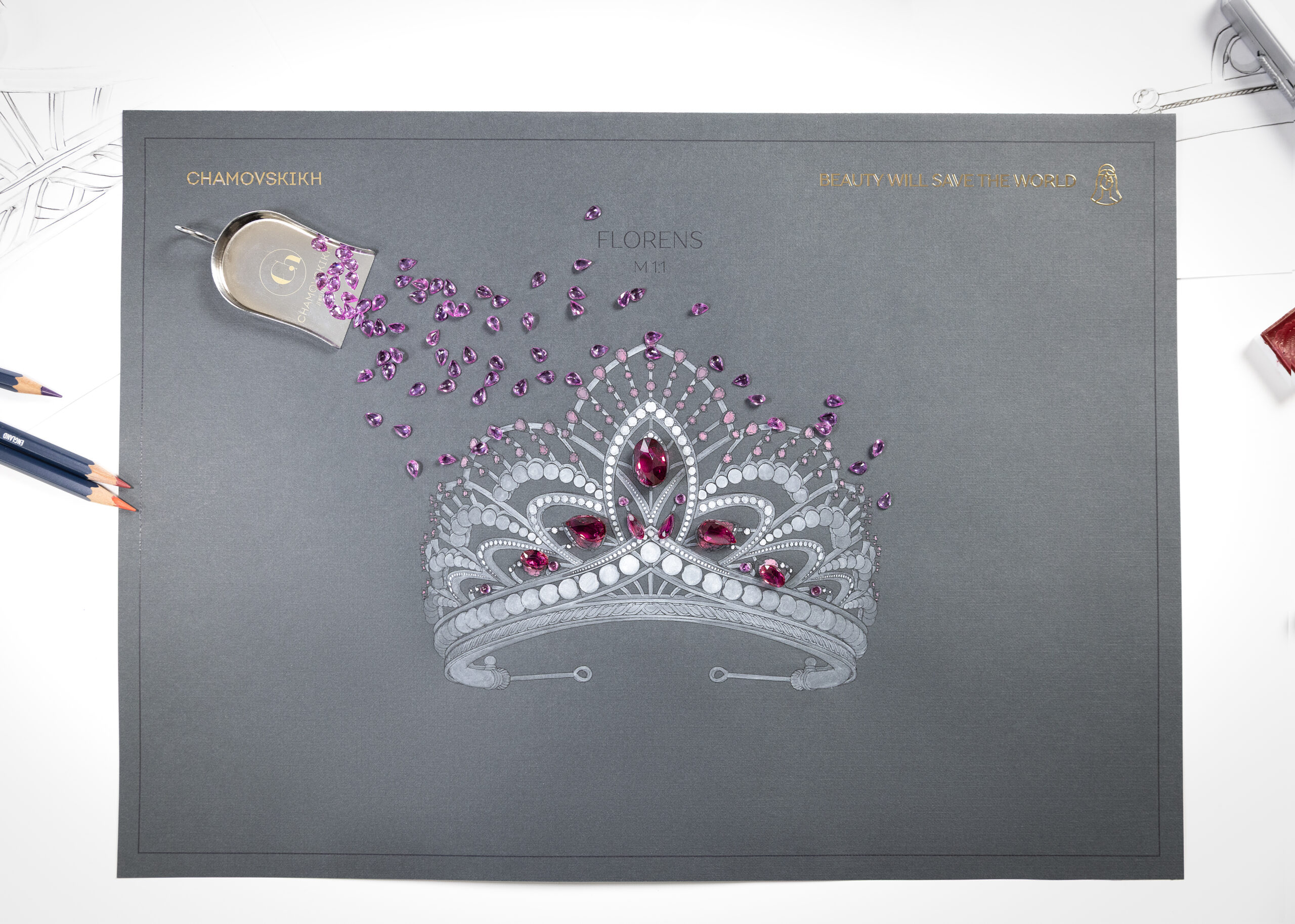 Над проектом год трудилась команда ведущих специалистов Дома. Короны изготовлены из золота и инкрустированы драгоценными камнями премиальных характеристик. Для каждого титула разработан уникальный механизм, позволяющий корректировать размер украшения.