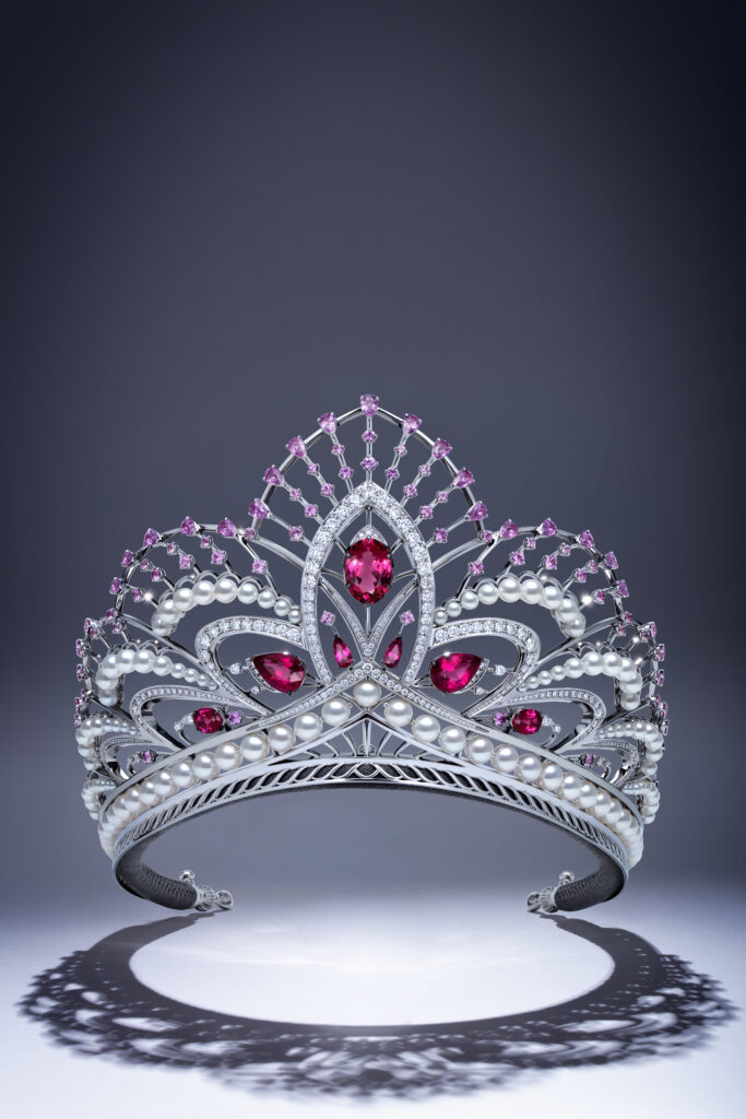 Корона Augusta Magna (MRS BRICS) — величественная «Великая Аугуста» с бриллиантами, жемчугом Акойя и морганитами. Венчающий корону алый рубеллит демонстрирует красоту как силу, способную соединять культуры и формировать духовное единство.