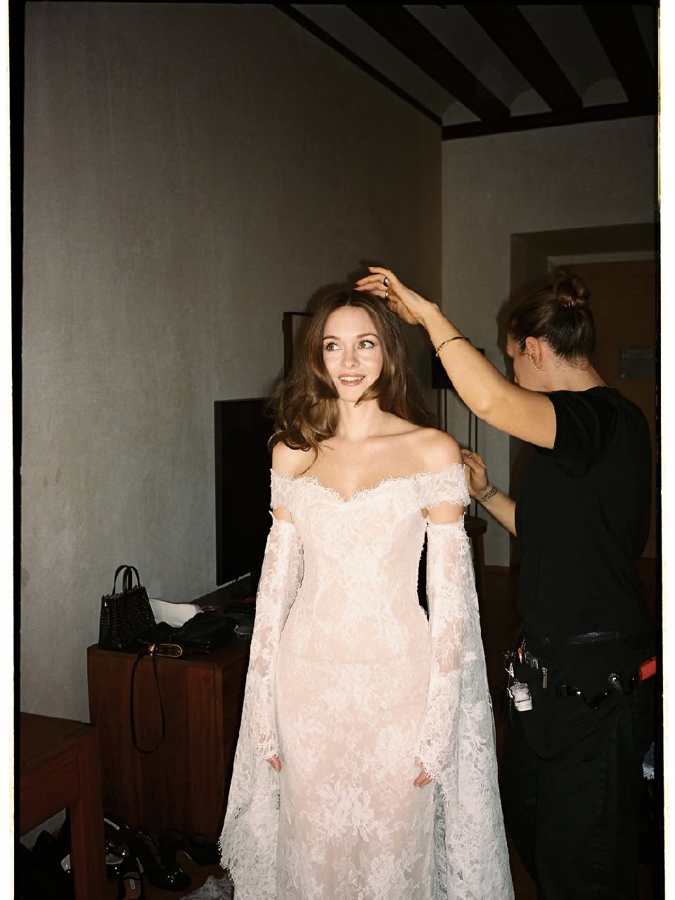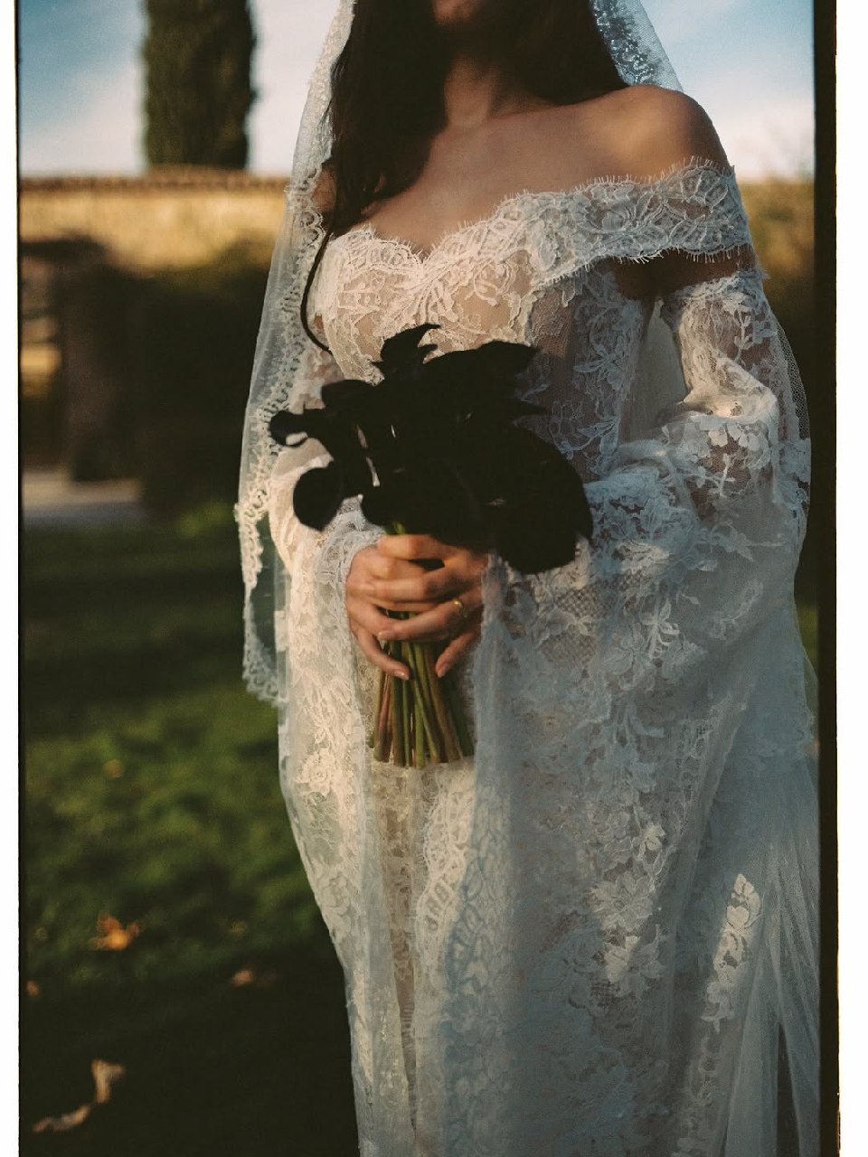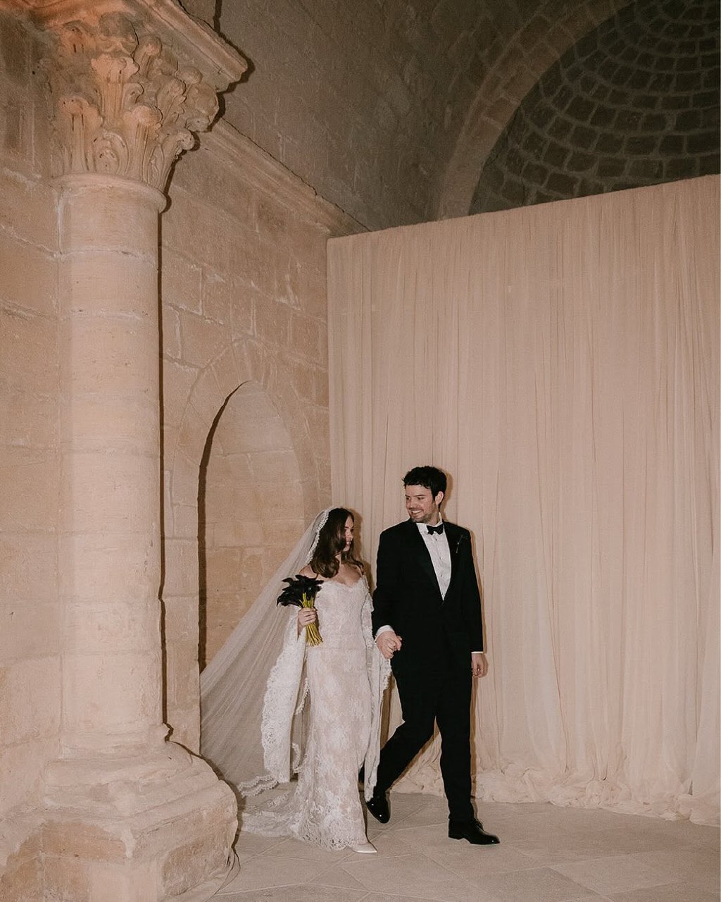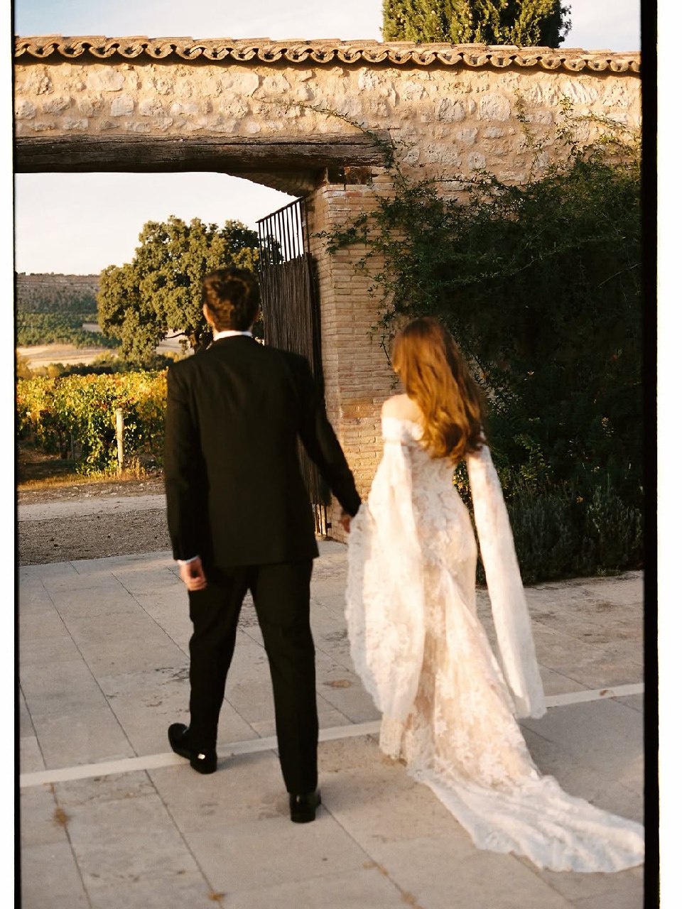 Торжество состоялось в октябре в величественном аббатстве Ретуэрта-ле-Домен в Вальядолиде, в Испании. Однако подробности и фотографии с праздника появились только на днях. Для основной церемонии невеста выбрала кастомное платье Rodarte из шифона и кружева с открытыми плечами и шлейфом в готическом стиле. На изготовление наряда ушло 9 месяцев.