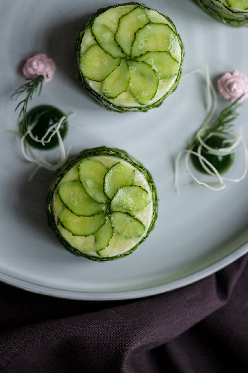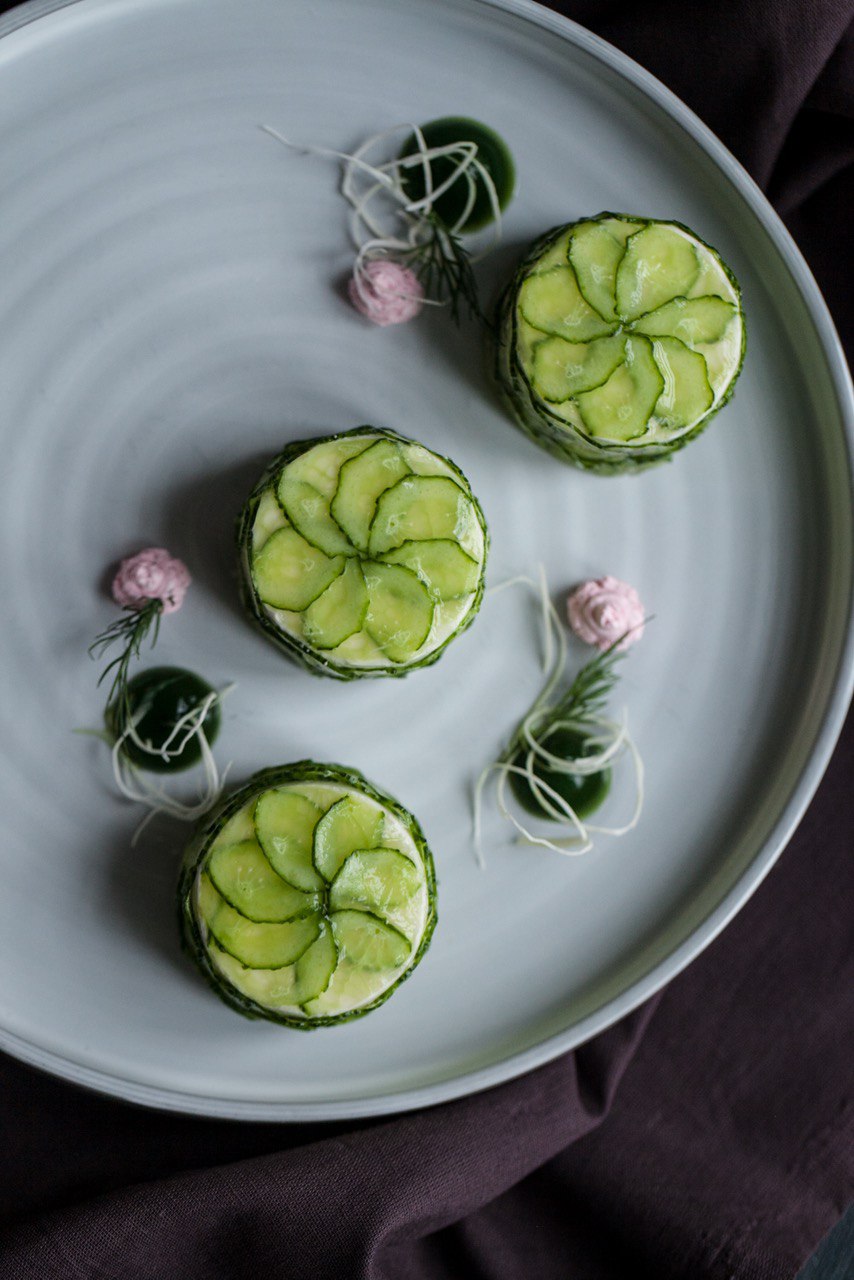Крабовый салат мы готовим из фаланг камчатского краба и подаем с кремом из сладкой кукурузы, а традиционную «гадость» — заливную рыбу — украшаем тонкой вуалью из огурца.