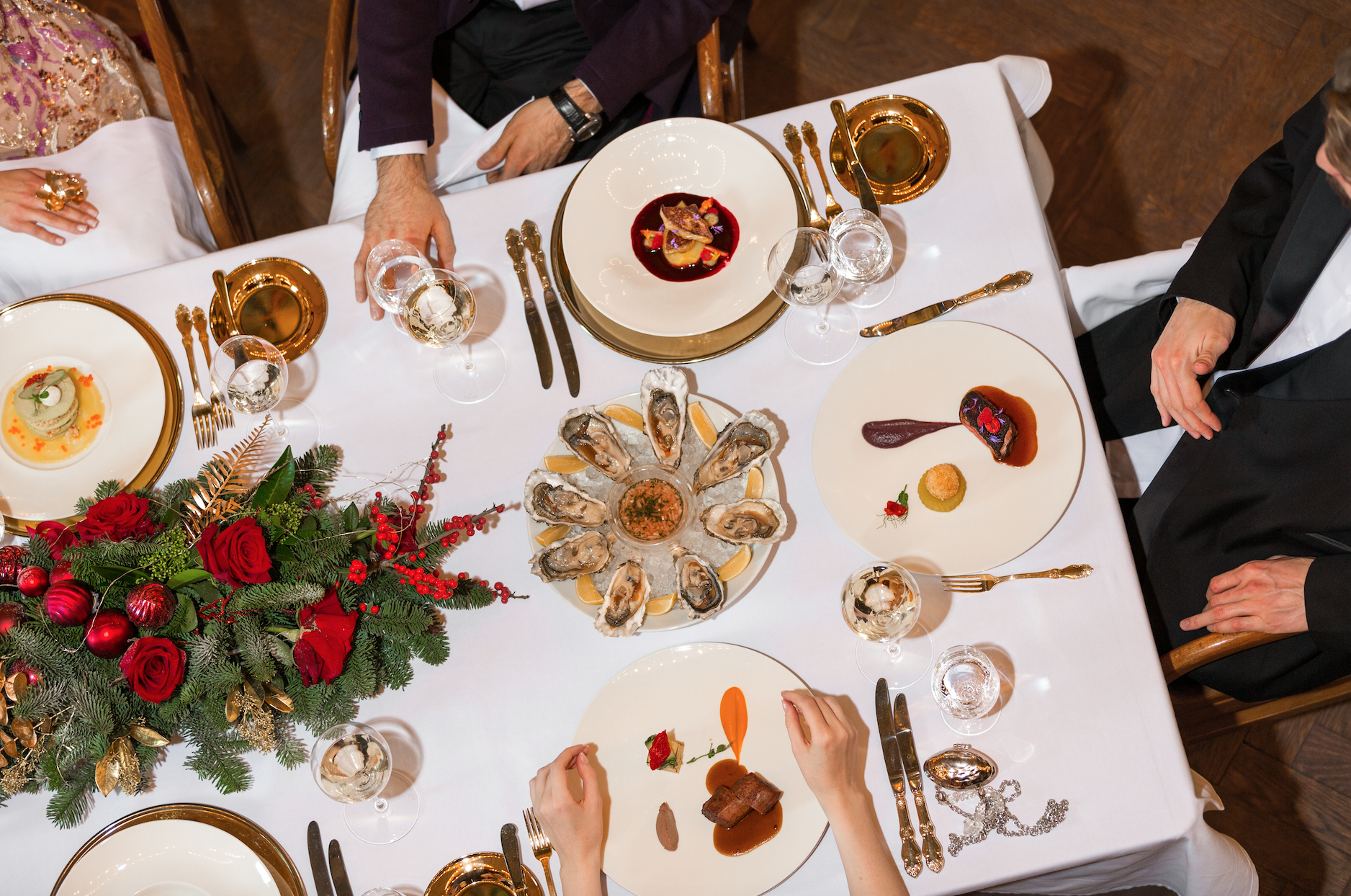 На праздничном столе будет свое действо — специальное меню из пяти курсов от шеф-повара отеля Дженнаро Конте и шеф-повара Quadrum Константина Нецветаева. Помимо обильных закусок с осетром, икрой трески и утиным хамоном, в качестве порционной холодной закуски подается камчатский краб со страчателлой и крабовым биском, горячей — равиолоне со шпинатом и карпаччо из выдержанного рибая и черным трюфелем. Основное блюдо — ролл из лакедры и королевской креветки или пирог с говяжьей щекой и фуагра на выбор.
