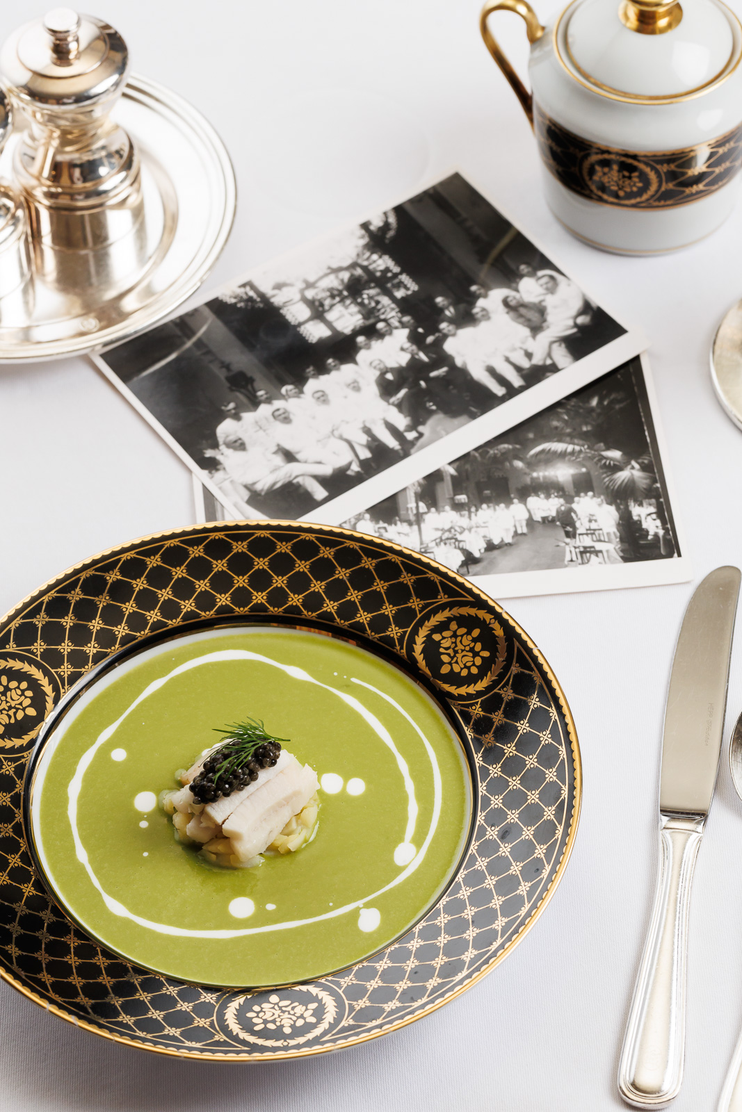 В ресторане «Икорный бар» представлены четыре блюда из дореволюционных меню отеля: праздничного обеда семьи Бенуа 1896 года, данного в честь столетия пребывания династии в России, и обеденного меню 1916 года Павла Юльевича Сюзора, архитектора и одного из акционеров гостиницы в то время. В качестве холодной закуски выступает артишок с крабом, голландским соусом и икрой осетра. Далее следует крем-суп из спаржи с осетриной. Основное блюдо — говядина «по-парижски» с соусом из мадеры с фуа-гра и картофельным мильфеем. В завершении — ромовый саварен «Кальвиль» с фисташковым кремом и свежей малиной.