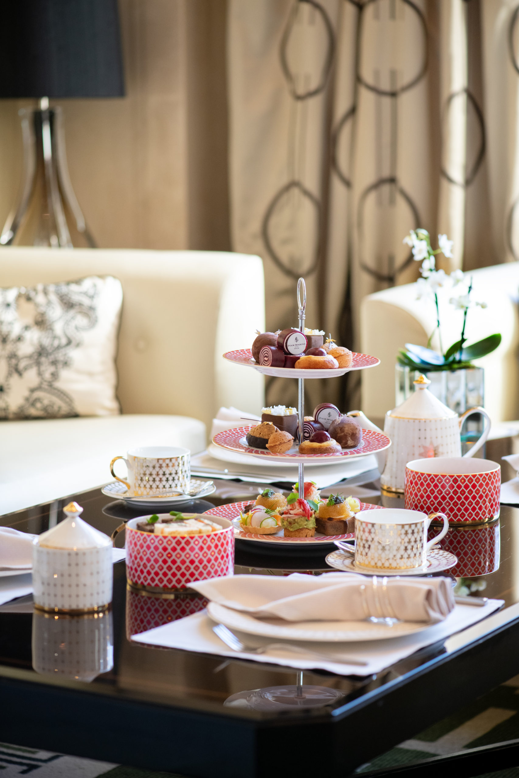 На многоярусной этажерке собрана коллекция сладостей и мини-закусок от шеф-кондитера Игоря Мельникова: калитка с щучьей икрой, тающие во рту «орешки» со сгущенкой, пирожное картошка, медовик, муравейник с карамельным молоком, малиновая пастила с маршмеллоу, ватрушка с творогом и многое другое. А в чайной карте отеля представлено 26 сортов ароматного напитка.