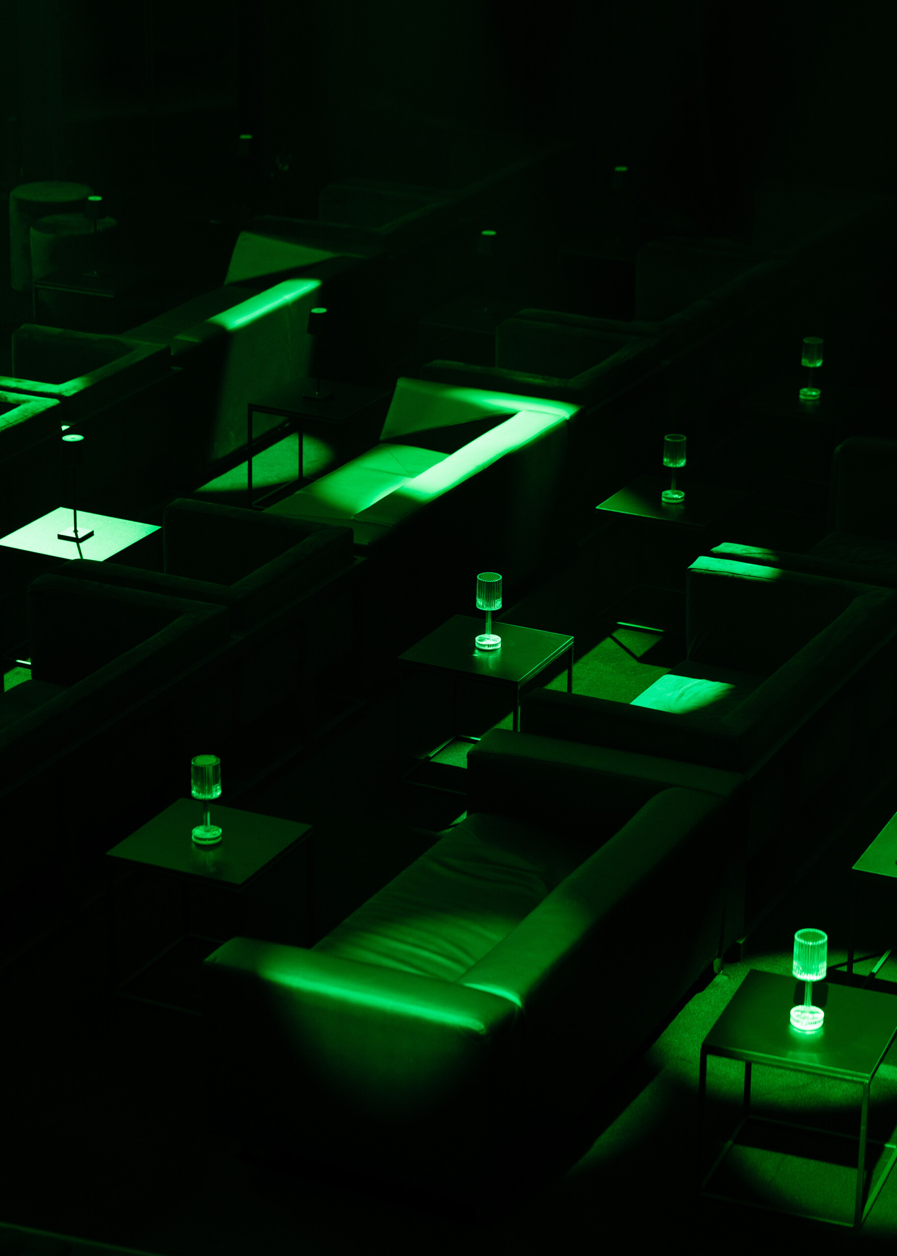 Одной из задач было рассадить 320 гостей и организовать для всех хороший обзор сцены. Для ее решения была построена многоуровневая трибуна, повторяющая форму верхних экранов и сцены: для VIP-гостей — удобные диваны, для тех, кто хотел быть ближе к бару — коктейльные столики.