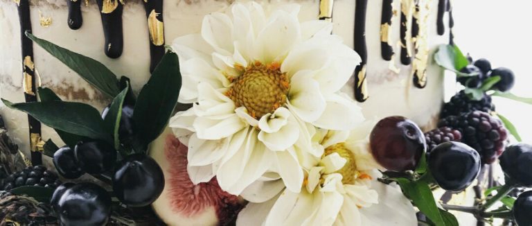 Свадебный торт: десерт с множеством фруктов, ягод и живых цветов