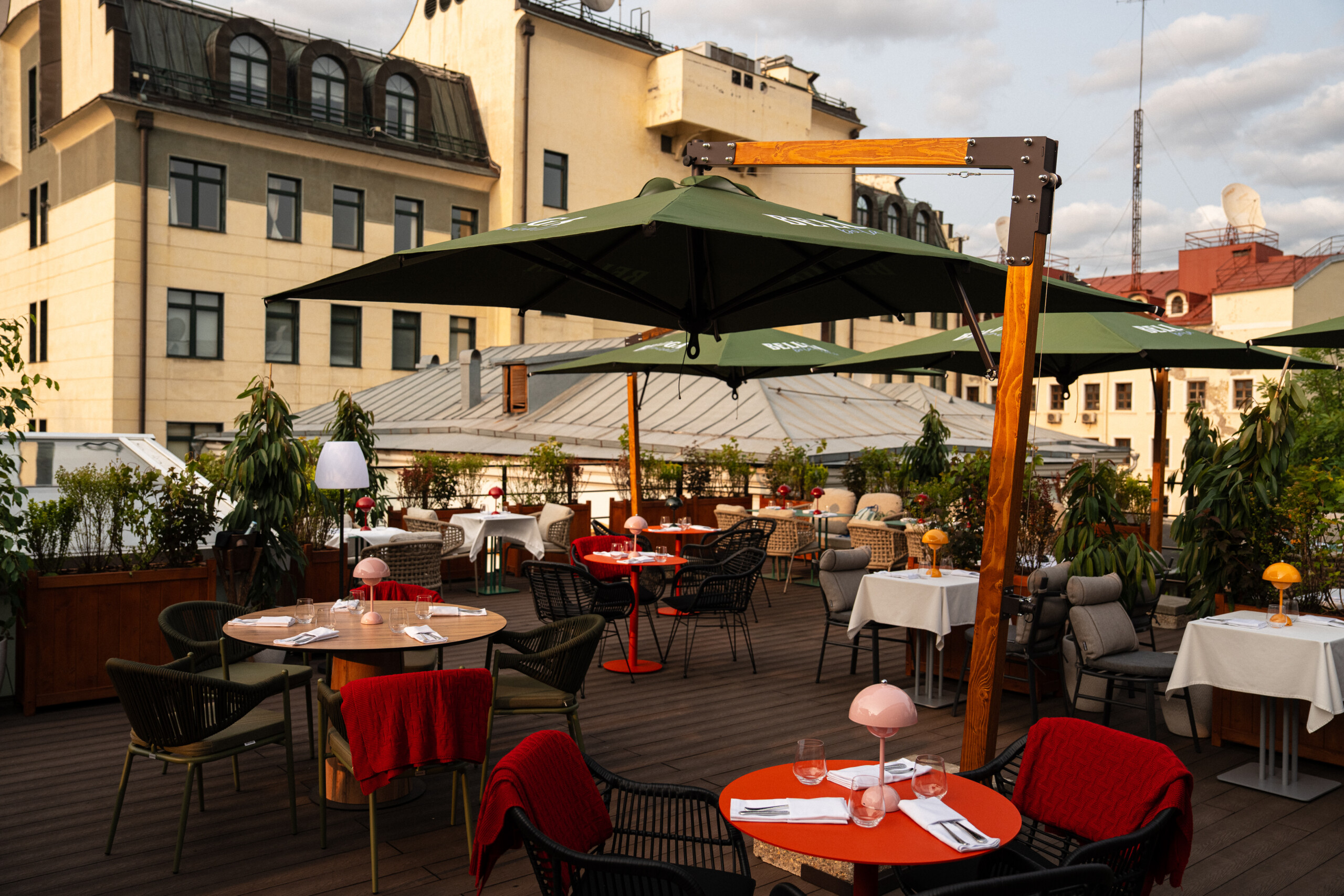 Яркая новинка на Большой Никитской расположилась выше крыш, где закатное небо становится частью ужина, выше бежево-серой повседневности и двух ресторанов Lumicino и Historia. Дизайн pop-up проекта собран в стиле эклектика, это значит, что стили, идеи и элементы смешаны в рамках одного интерьера. Бежевых или сине-белых классических веранд уже и так «выше крыши», поэтому было решено соединить разнообразны по стилистике кресла, стулья и цветные столы, а затем добавить яркие лампы и текстиль. Получилось пространство, где красиво на 360 градусов: вот розовая стена, вот жёлто-розовый леденцовый бар, вот обилие растений и цветов. Особенно приятно, что расположена веранда на крыше и комфорту не мешают ни машины, ни пешеходы. Вид на высотку и московские крыши прилагается в качестве приятного бонуса, а сорбет с игристым, чтобы скрасить ожидание.