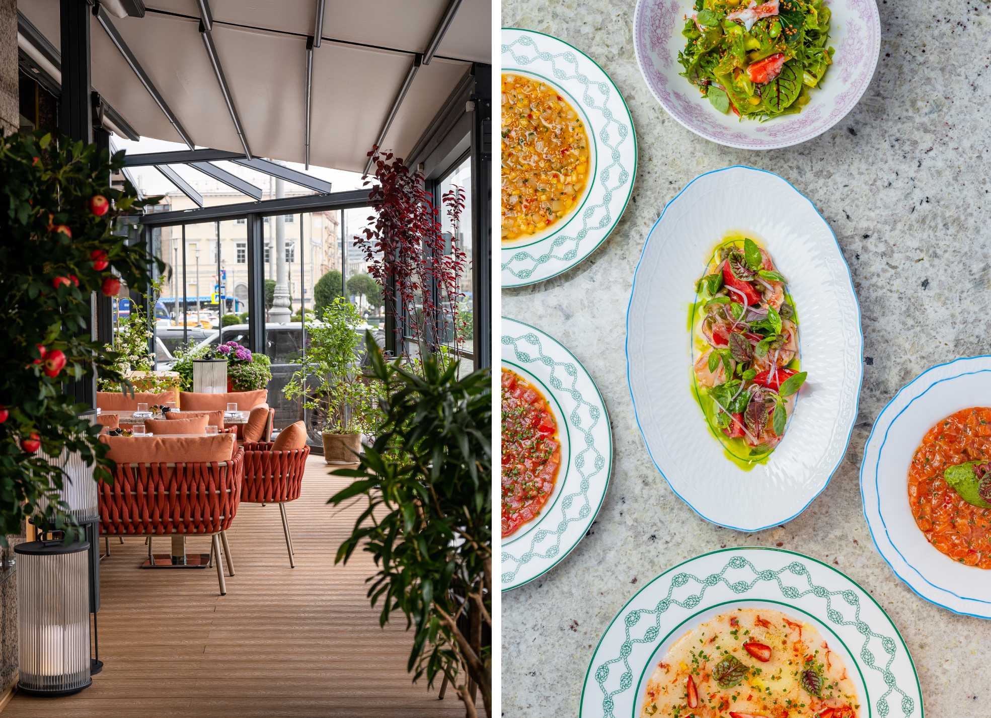 У BURO Bistro на лето большие виды: с новой просторной террасы. Новую террасу увили зеленью, украсили живыми цветами, спрятали под раздвижной крышей. Меню от бренда BURO Егора Макарова и шефа Bistro Александра Кузнецова такое же летнее и красочное, в его основе понятные сочетания, которым два шефа добавляют новые яркие акценты. Как манго, шисо и чили, которые подчеркивают нежность и сладость гребешка, соус из водорослей комбу и даши, чтобы усилить морской вкус в тартаре из форели, или свежая клубника, добавляющая летнего настроения и спелого хруста карпаччо из креветок. Салат с креветками карри звучит остроумным твистом фирменному салату с цыпленком карри, гаспачо из цукини со шпинатом, мятой и базиликом на греческом йогурте на зеленый лад перепевает главную летнюю тему, но есть и вовсе ноу-хау. Как кефирная лепешка с рамиро, соусом тоннато и анчоусами, кальмар с жульеном из печеного перца и строганов из рапанов со сморчками, ради которых в BURO Bistro надо ехать специально. А потом сидеть долго на террасе, провожая закат, чувствовать искристую свежесть в сочетании игристого с грушей, липой, бузиной и содовой в Elissence и угадывать бархатистую сладость тропиков в волнующем миксе Caralis с персиковым ликером и маракуйей.