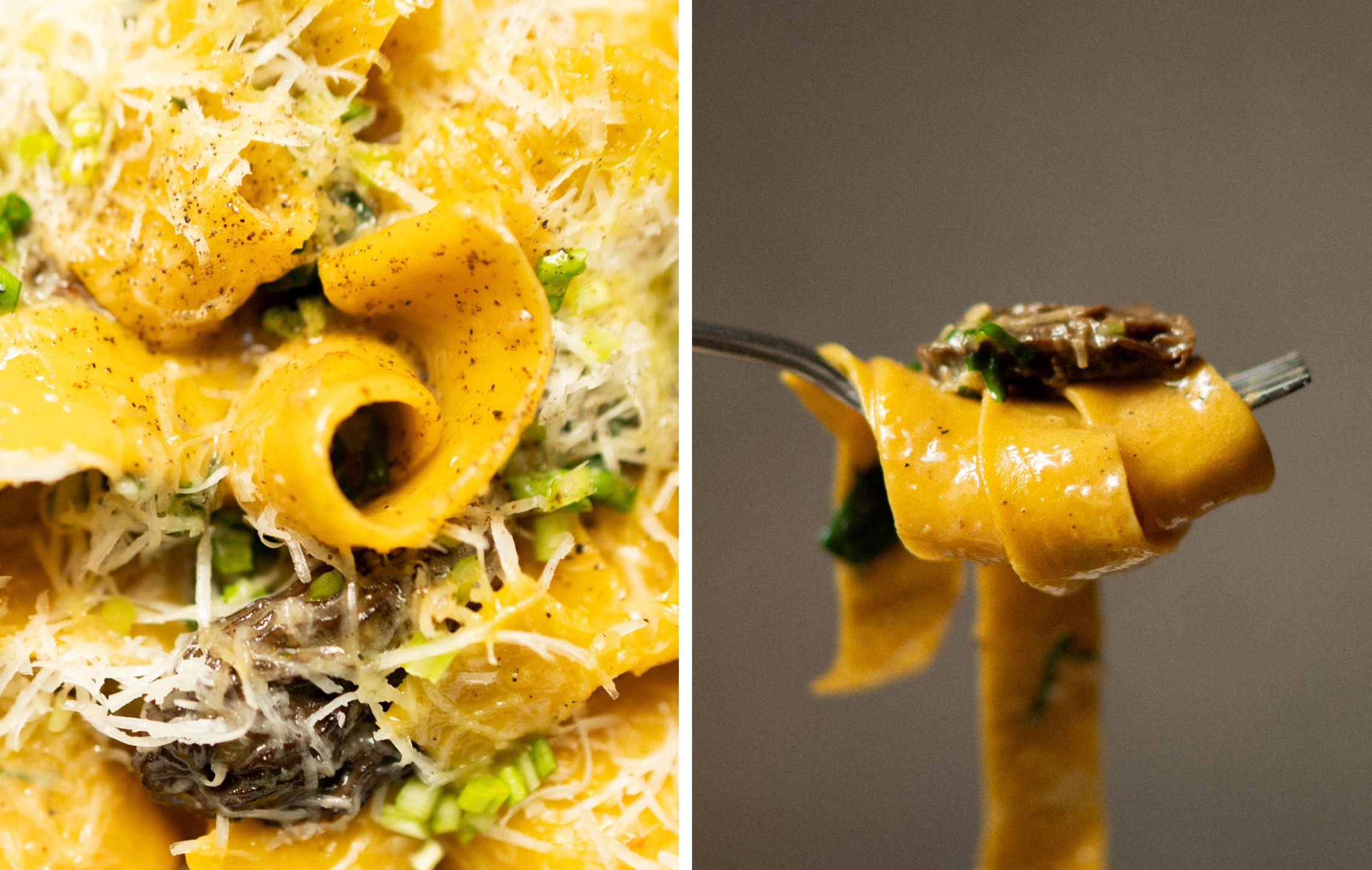 Шеф-повар Александр Русаков представил в камерной «Тильде» блюда с черемшой и первыми весенними грибами. Желто-оранжевую домашнюю пасту, что готовится вручную из твердых сортов пшеницы с добавлением куриных желтков и морковного фреша, шеф дополняет жареными сморчками, черемшой и соусом на основе грибов, куриного бульона и пармезана, а в конце трет сверху пикантный пекорино.
