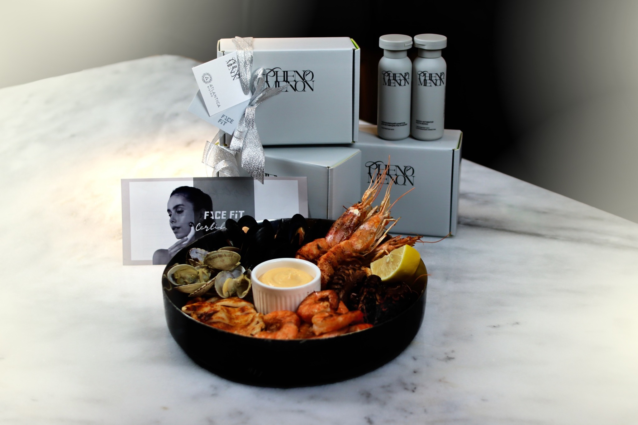 В Atlantica Bistro (Большая Дмитровка, 23, стр. 1; Цветной бульвар, 11/2) стартовала коллаборация с брендом Phenomenon. В рамках проекта можно заказать морское плато: на льду — магаданские креветки, морские ежи, устрицы, мидии, дополненные винным и соевым соусами, или на гриле — аргентинские и тигровые креветки, осьминог, мидии, командорский кальмар и моллюски вонголе, сопровождаемые острым соусом. И получить приятный бьюти-подарок — бокс с косметическими продуктами в тревел-формате от Phenomenon.