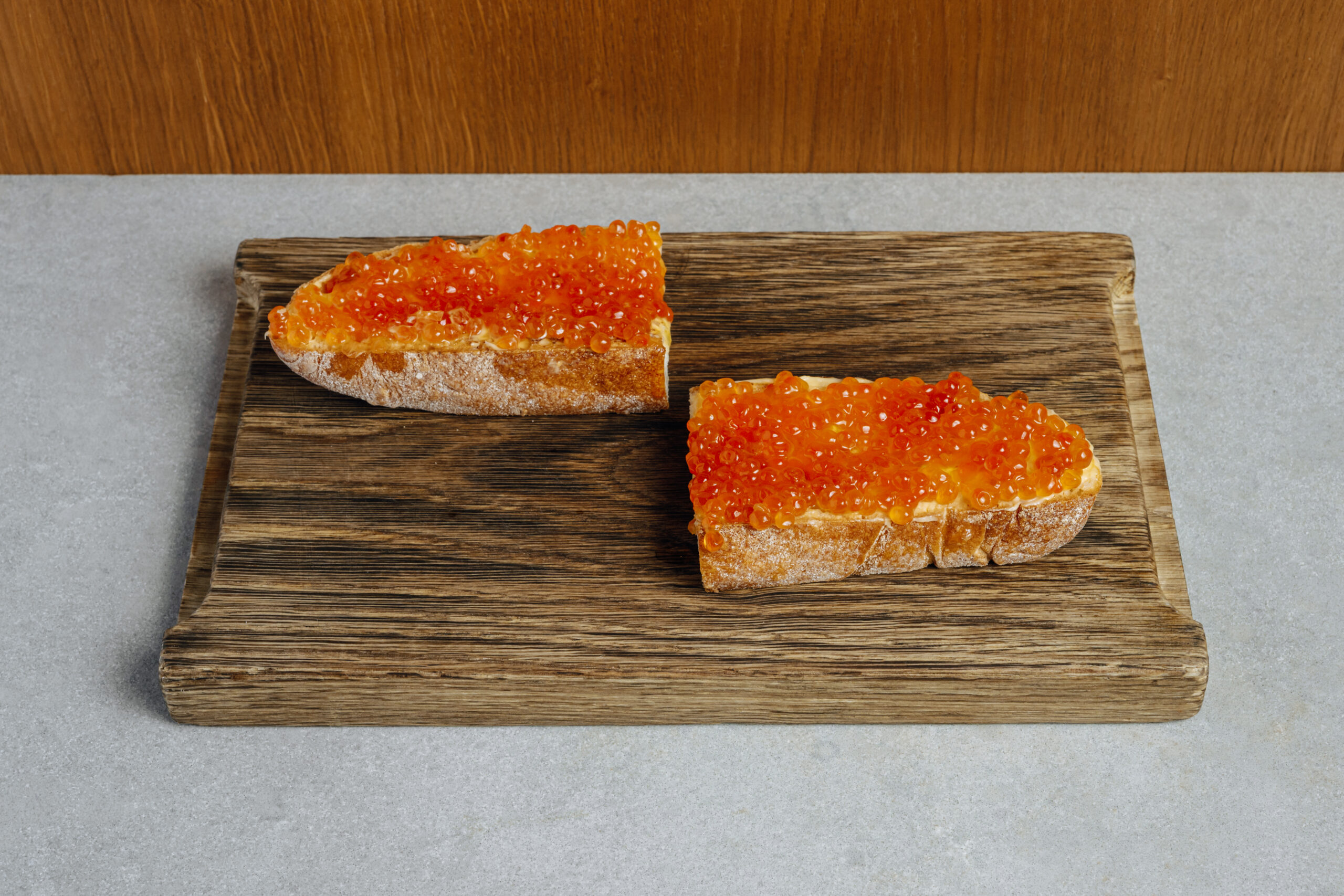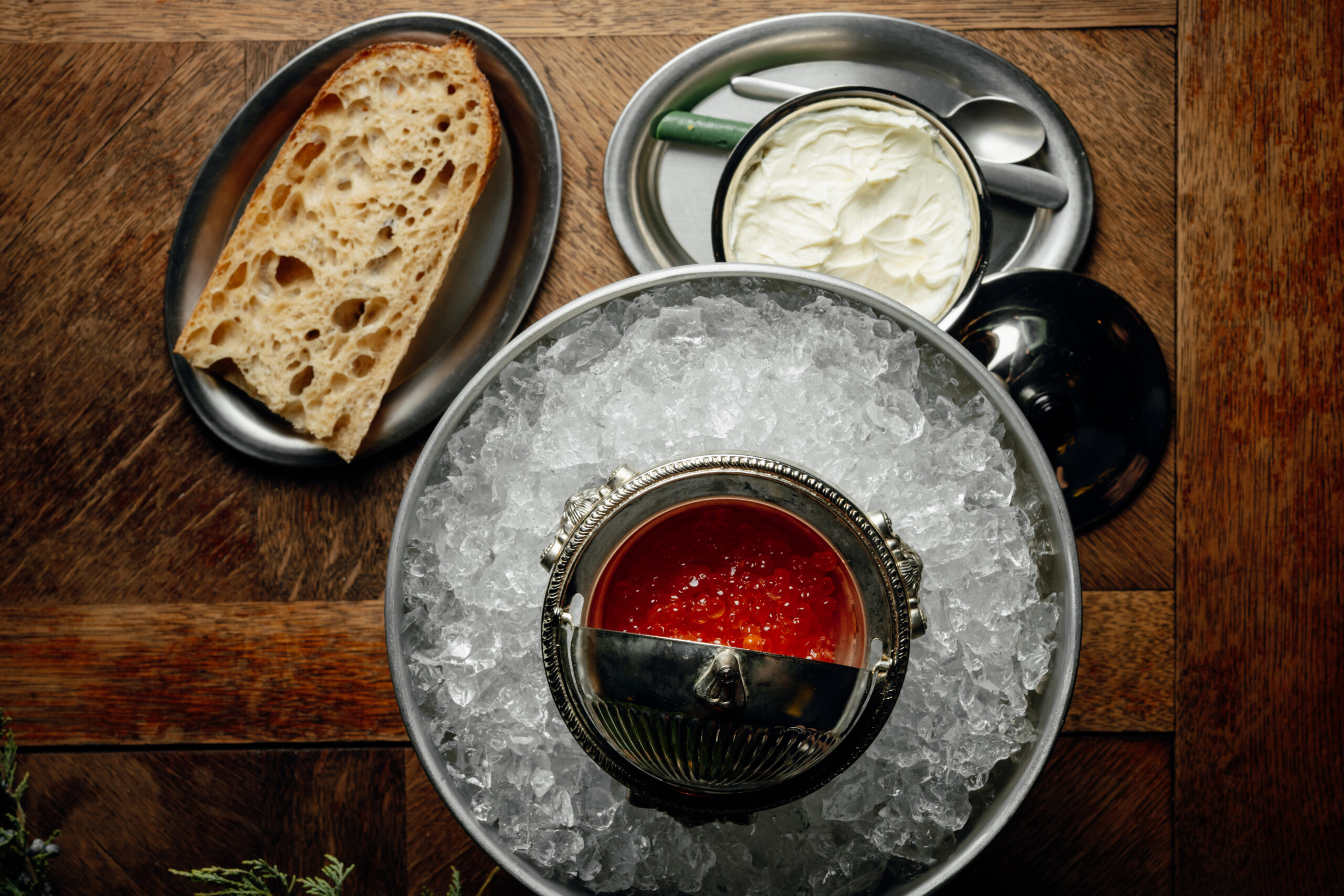 Деструктурированный крабовый с настоящим камчатским крабом и маринованными сегментами кукурузы подают на салатных листьях, дополняя хрустящими аранчини — рисовыми шариками в панировке. Оливье превратился в закуску: салатом с сальсой из мандаринов и креветок начиняют тонкие черные тарталетки, а затем украшают красной икрой. Без икры в Новый год действительно никуда. Щедрый бутерброд с красной готовят прямо при госте: половину багета смазывают слегка взбитым маслом и накладывают деликатес из винтажной икорницы на льду. Черную же добавляют к трем яйцам-пашот в масле нуазетт с ореховыми нотами.