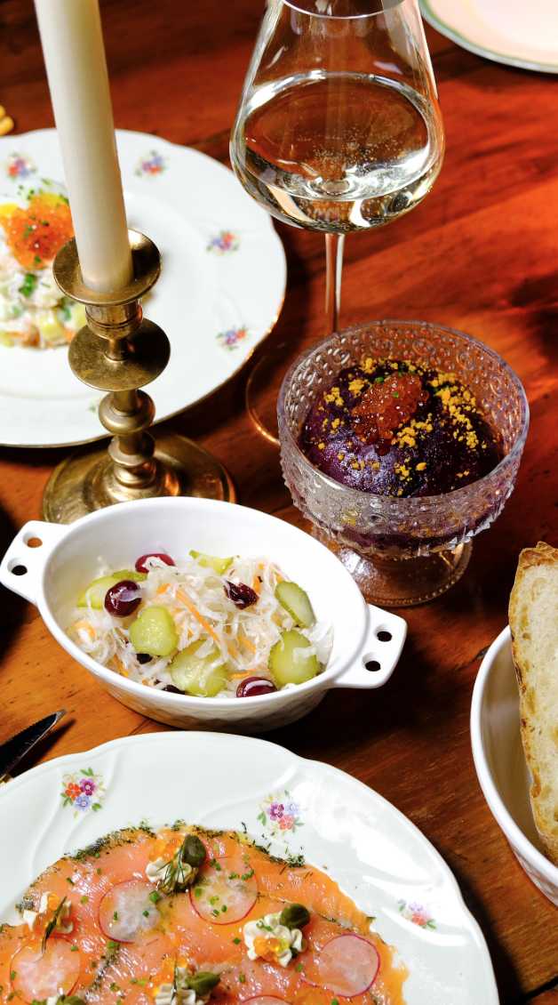 И конечно, ни один русский Новый год не обходится без традиционных героев — но здесь они предстают в авторской, праздничной версии. Сельдь под шубой — с запеченными овощами, домашним майонезом и изысканным дуэтом: икра лосося и боттарга. Оливье с камчатским крабом — сочное крабовое мясо, запеченные овощи, свежие огурцы и перепелиное яйцо с красной икрой — знакомый вкус, который будто заново прошел французскую школу.
