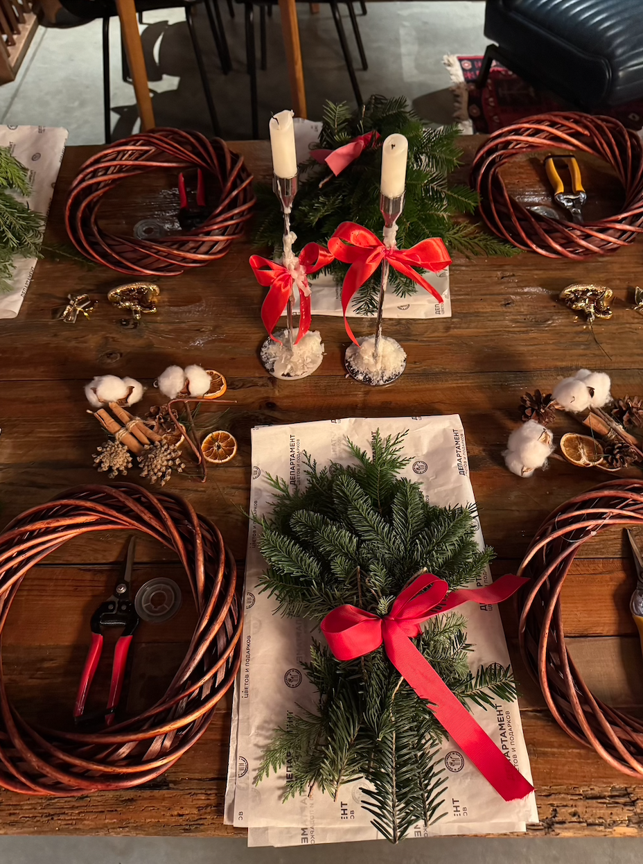 Гости создадут уникальные композиции, которые станут не только украшением дома, но и идеальным подарком для родных и близких. В ходе мастер-класса участники самостоятельно сплетут еловый венок, а затем выберут декор из разнообразных украшений. Хлопок добавит текстурные акценты, ароматная корица и сушеные апельсиновые дольки наполнят пространство пряным запахом, а натуральные шишки привнесут уют. В завершении флористы бережно упакуют все композиции в коробку и украсят изящным бантом, чтобы гости могли забрать их домой.