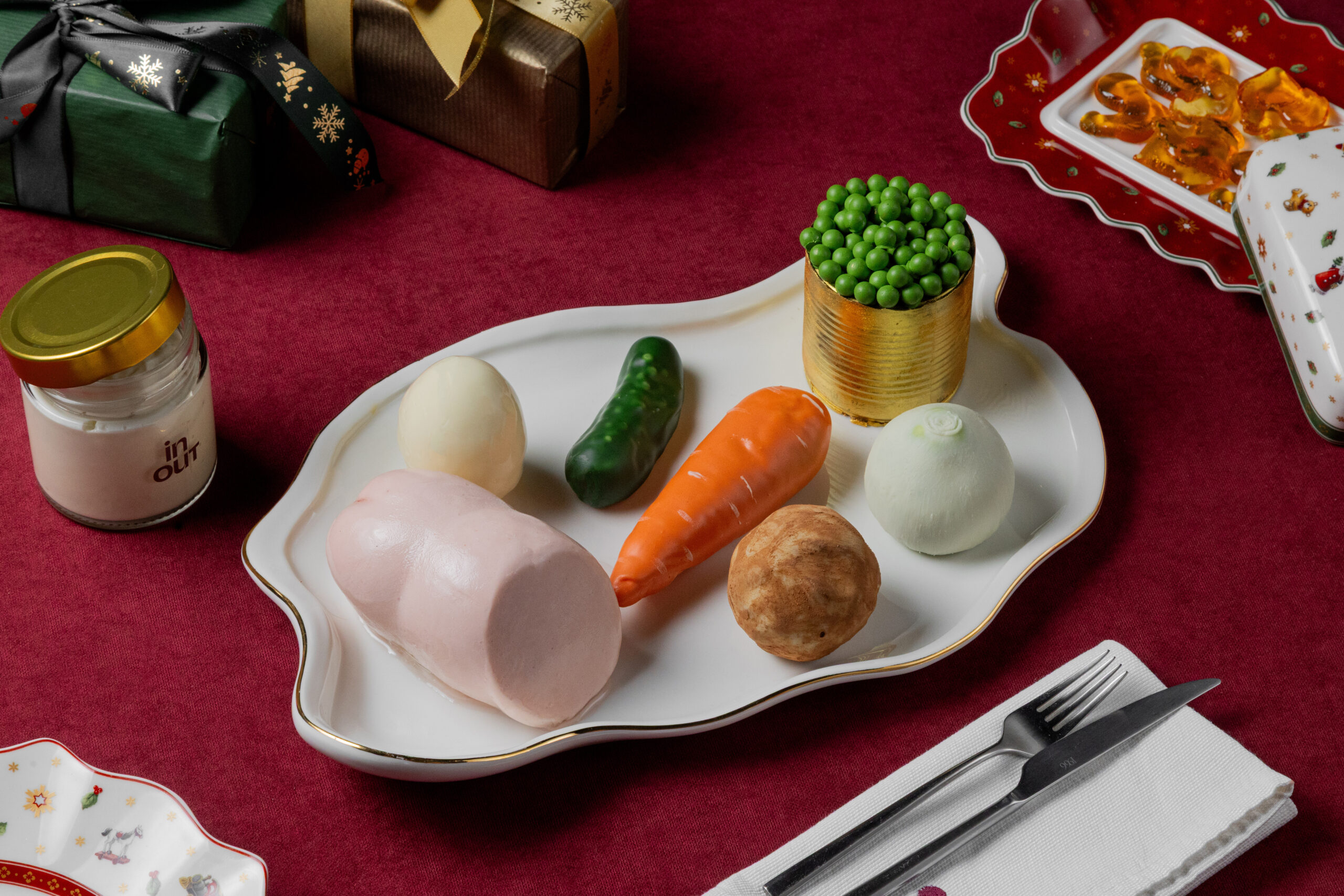 У «Горошка» — вкус молочного шоколада и вареной сгущенки. Под крышкой банки «Майонеза» — имбирный крем с начинкой из мандаринового курда и фундучно-гречневой меренги. «Докторская колбаса» и вовсе пахнет клубникой, юдзу и фисташками. Шеф-кондитер InOut (Зубовская, 7) Лианна Хуснуллина разобрала главное блюдо новогоднего стола на ингредиенты и каждому посвятила отдельный десерт. Теперь можно ограничиться «Огурцом» и даже «Луком» или взять все восемь и собрать «Оливье» прямо на своей тарелке.