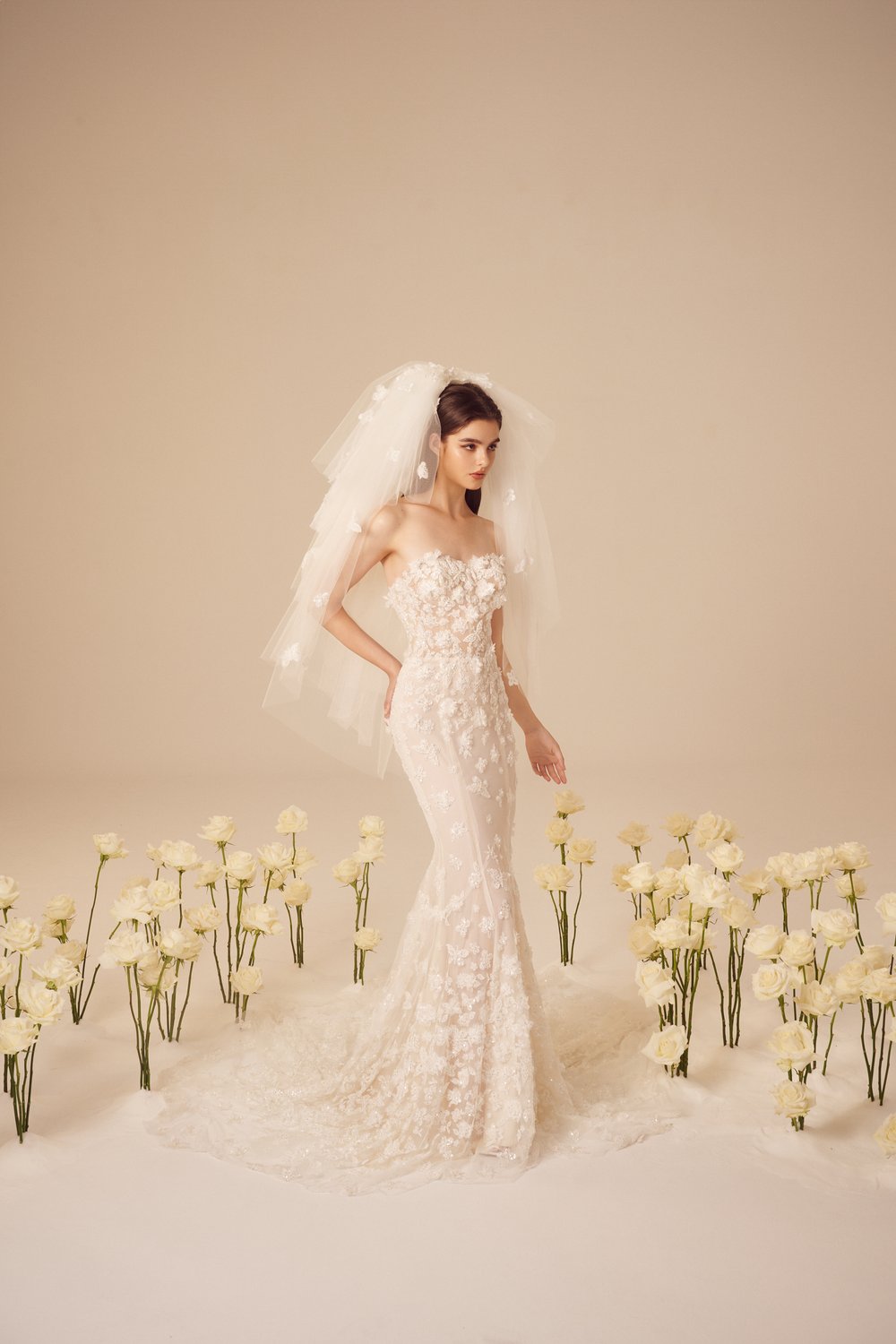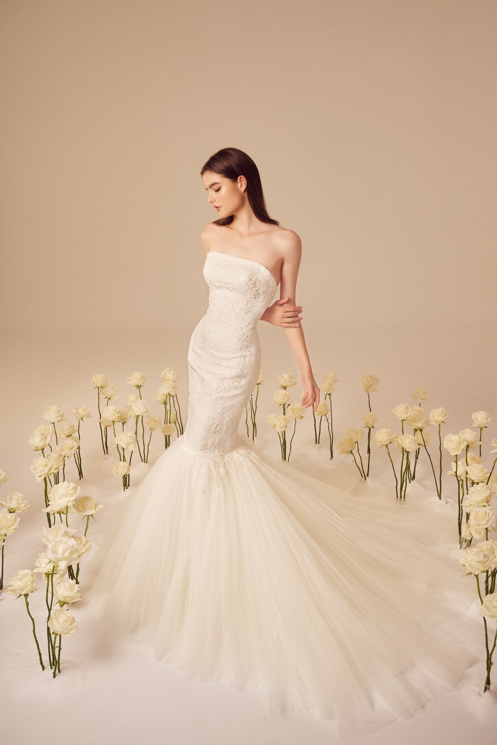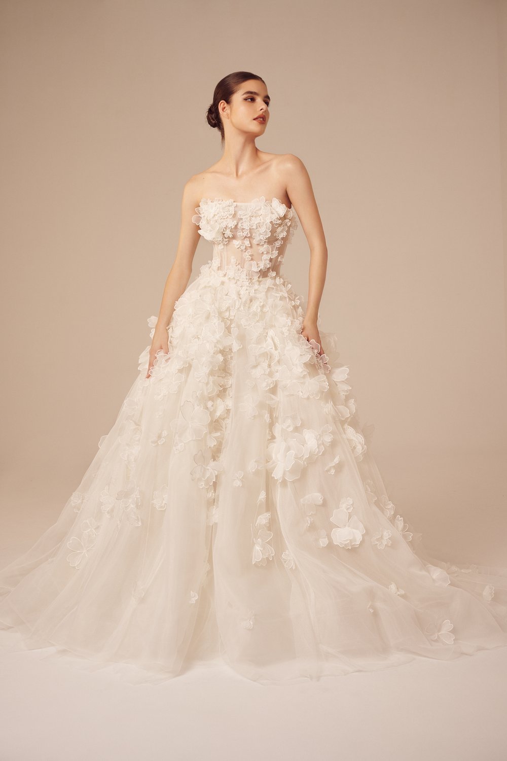В коллекции преимущественно использованы классические и женственные силуэты платьев: корсетные топы, объемные юбки, фасон «рыбка». Большинство нарядов украшают 3D-цветы из ткани или цветочная вышивка. На белоснежных платьях красуются объемные камелии и розы разных размеров. Их удачно дополняют аксессуары: многоярусная фата, атласные перчатки до локтя, заколки с жемчугом.