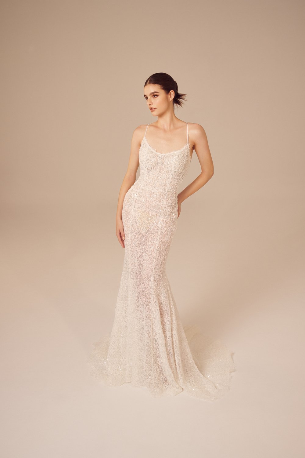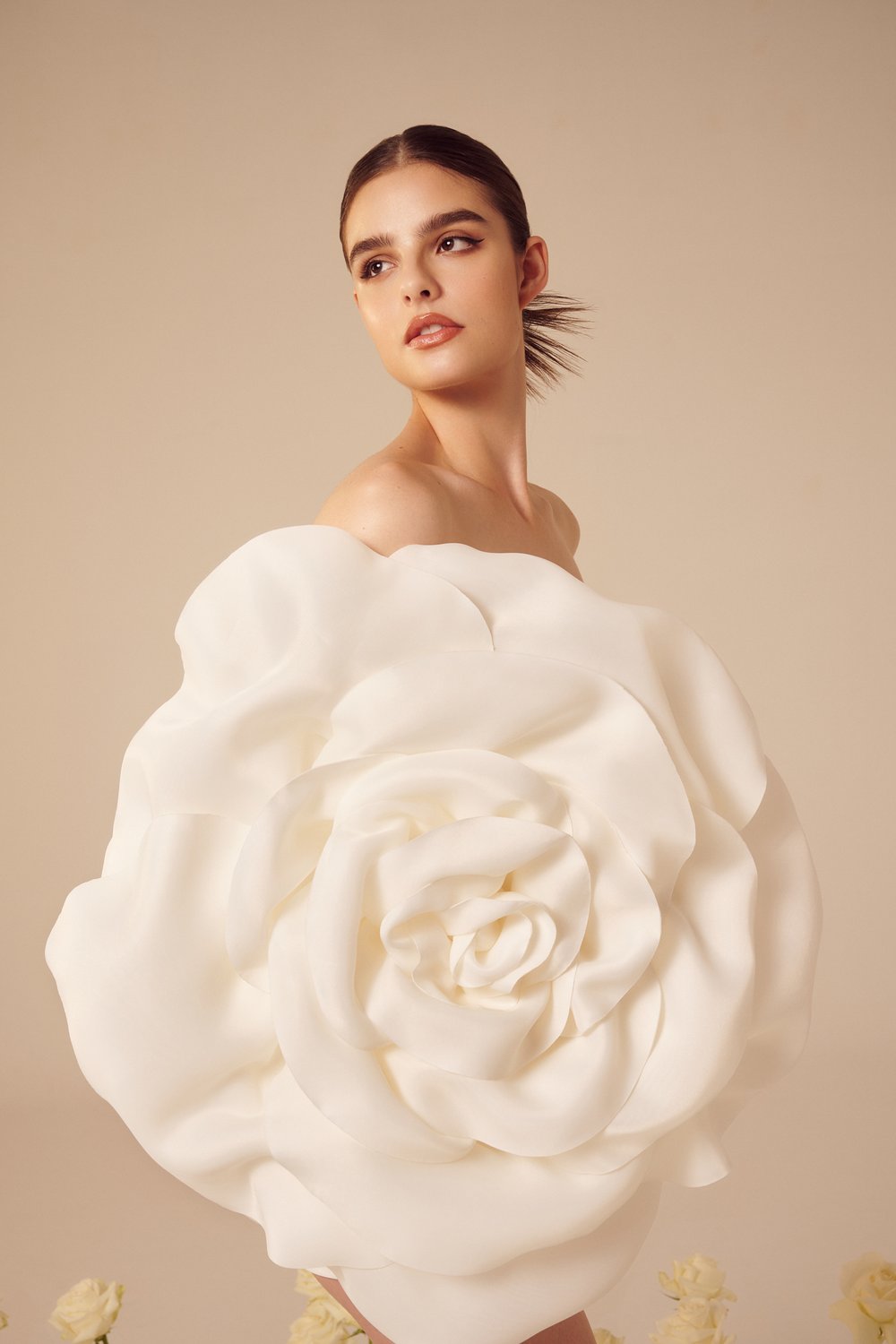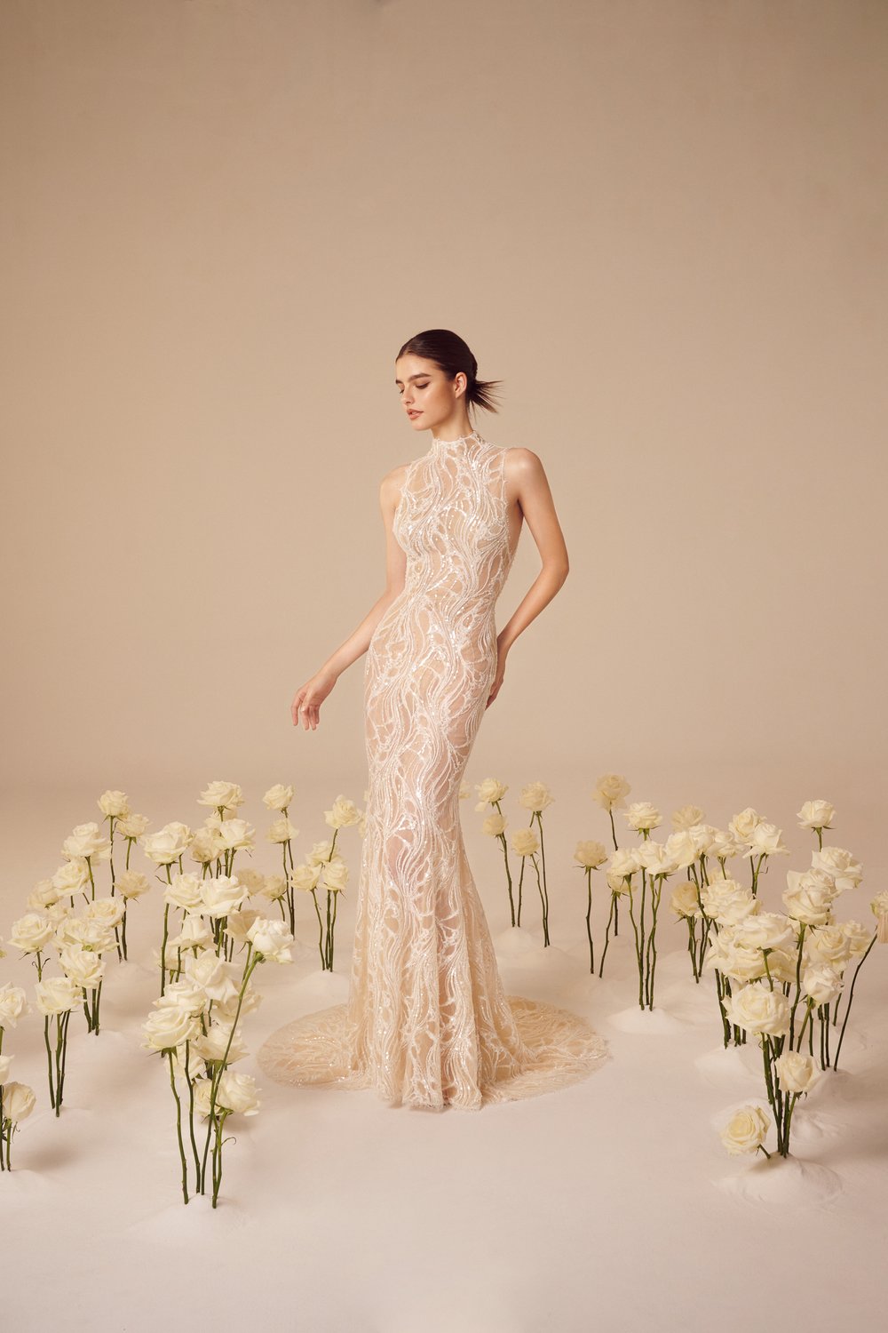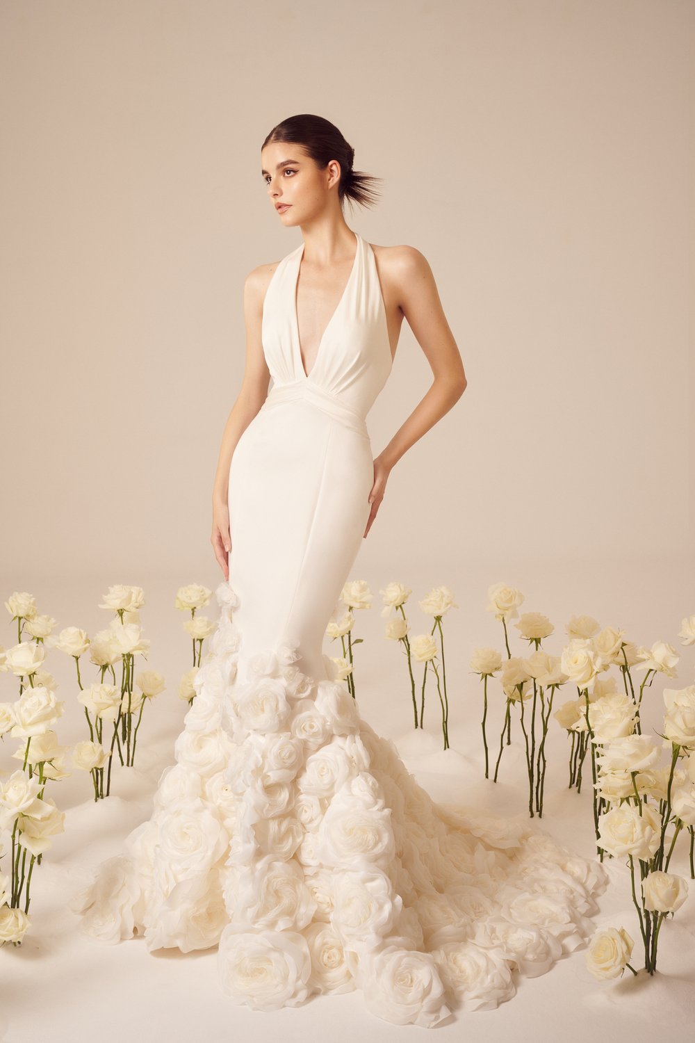 В коллекции преимущественно использованы классические и женственные силуэты платьев: корсетные топы, объемные юбки, фасон «рыбка». Большинство нарядов украшают 3D-цветы из ткани или цветочная вышивка. На белоснежных платьях красуются объемные камелии и розы разных размеров. Их удачно дополняют аксессуары: многоярусная фата, атласные перчатки до локтя, заколки с жемчугом.