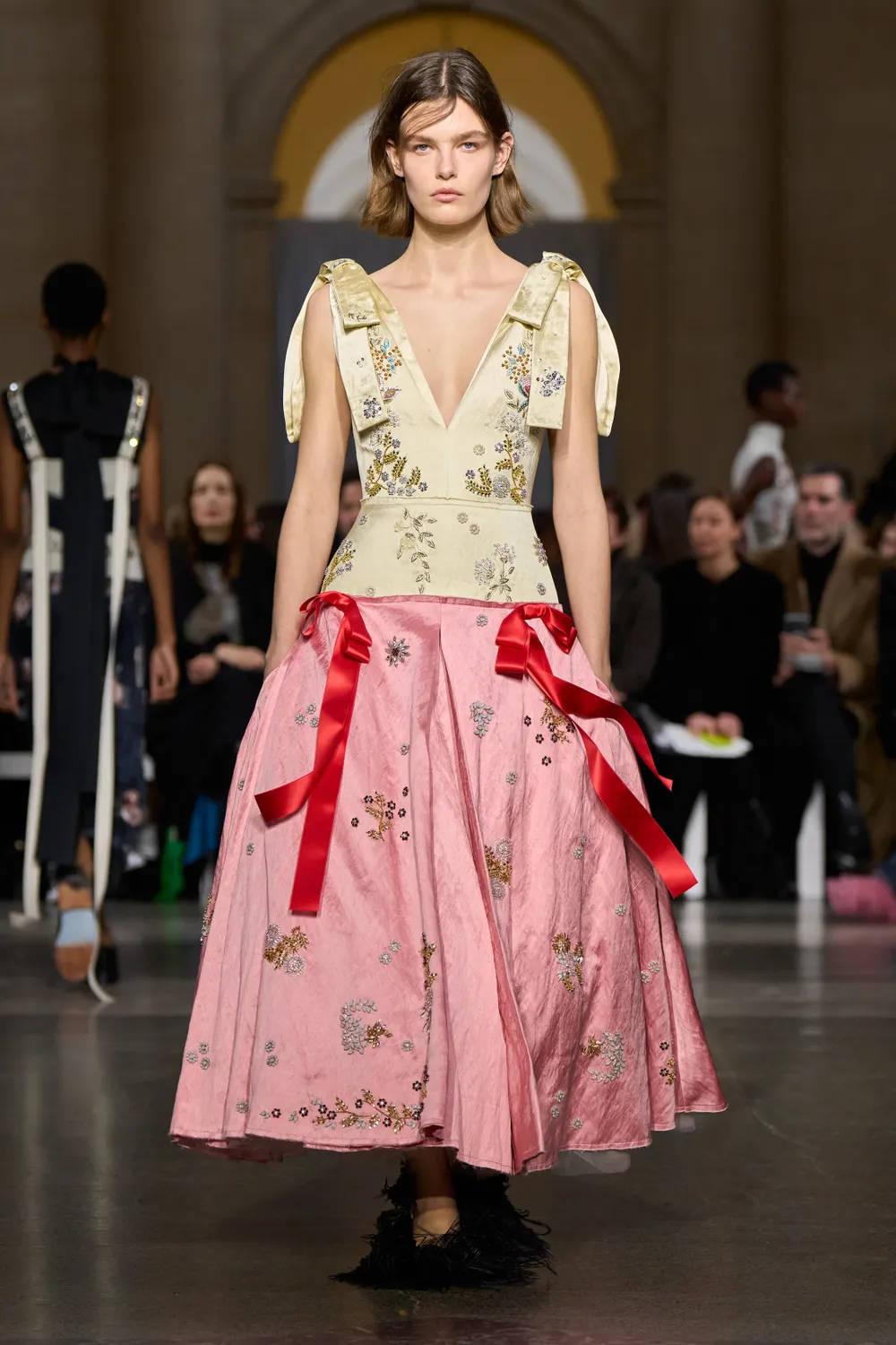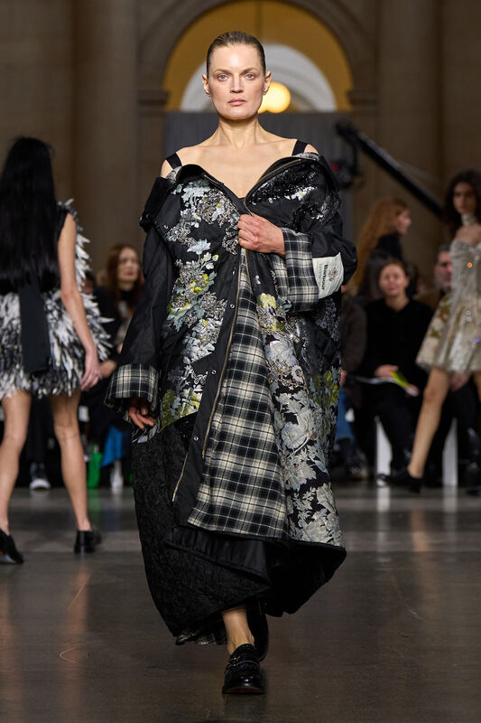 Симон Роша предложила сочетать нежное кружево, пышные юбки и цветочную органзу с грубоватыми спортивными бомберами. Дизайнер создала идеальный контраст: нарядная основа и уютный верх. Прием идеален для невесты на второй день свадьбы или для гостьи, которая хочет выглядеть романтично, но без лишней слащавости.
