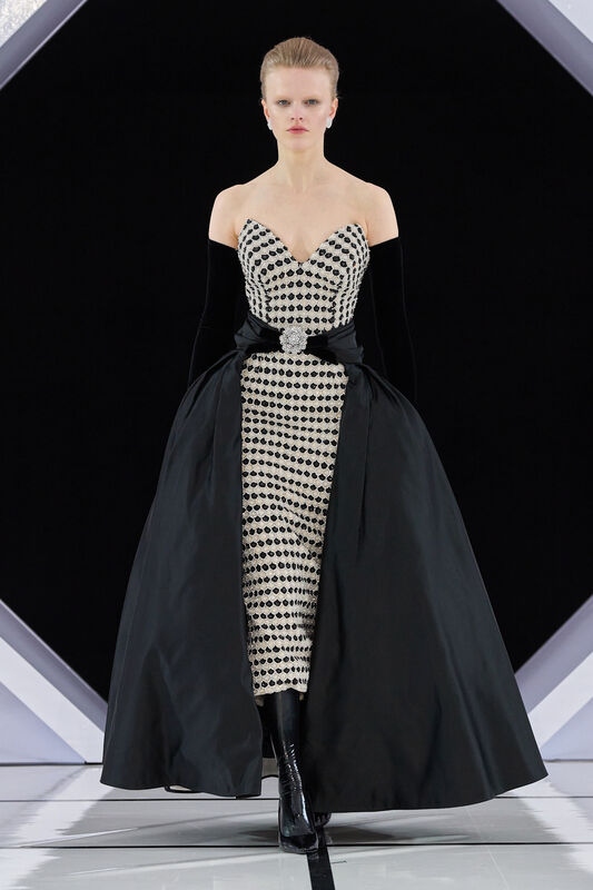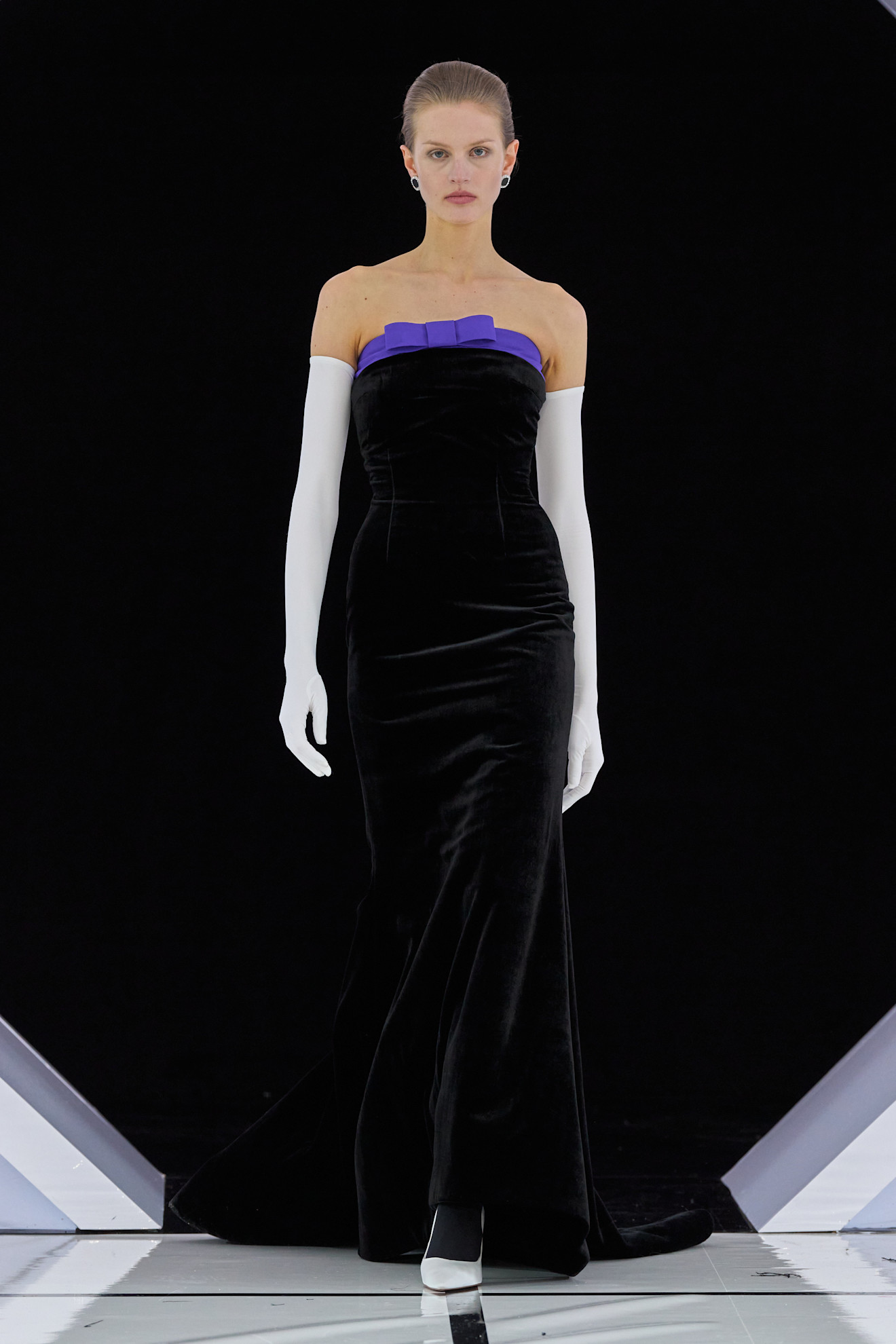 Оперные перчатки + платье с открытыми плечами (Richard Quinn)