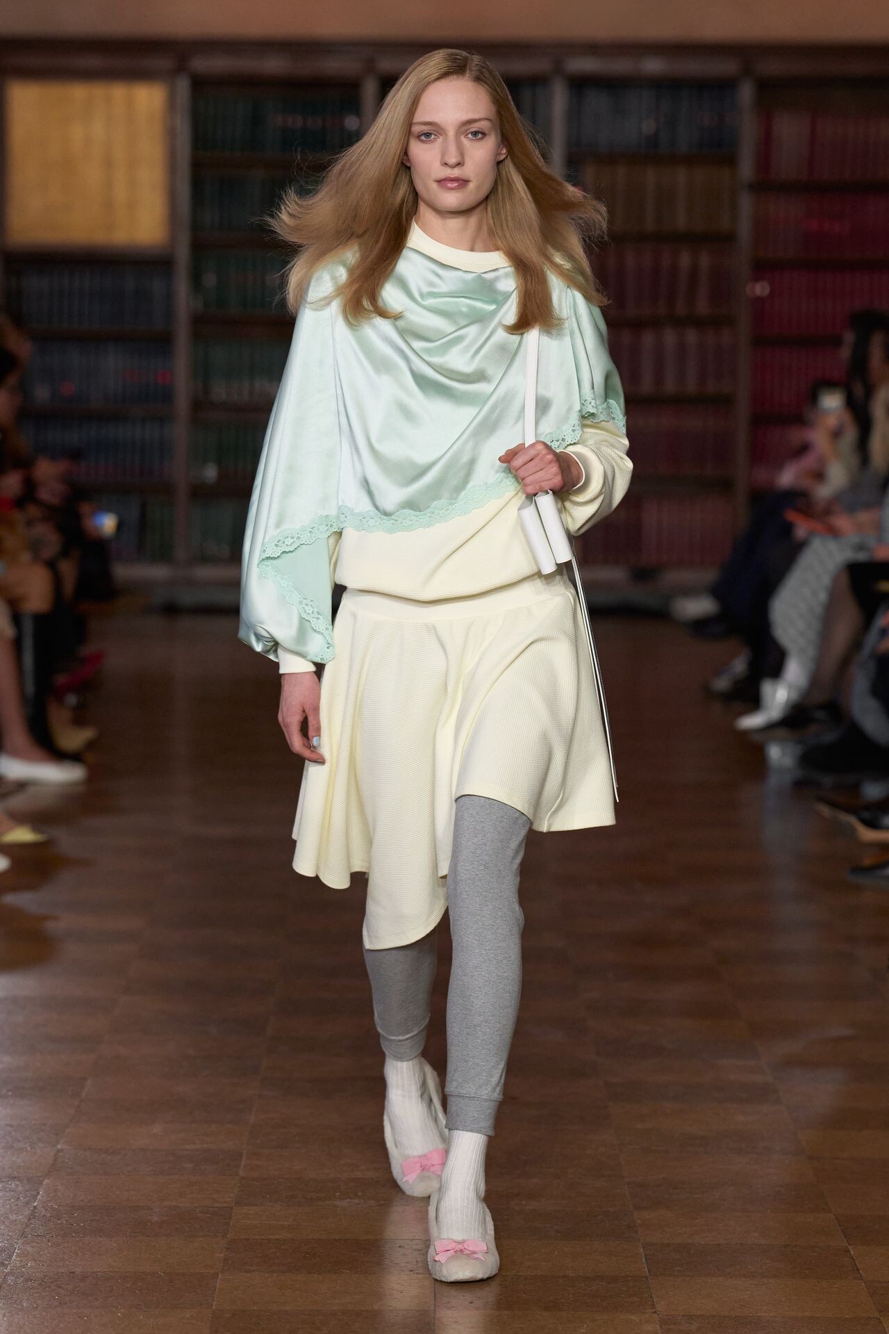 Sandy Liang проявила заботу о модницах: в ее коллекции ко всем платьям и юбкам прилагаются шерстяные леггинсы и носки. Это не только практично для прохладной погоды, но и стильно. Сочетание женственной юбки-миди с уютными леггинсами создает тот самый «герли» образ, который идеально впишется в дресс-код уличной свадебной церемонии.
