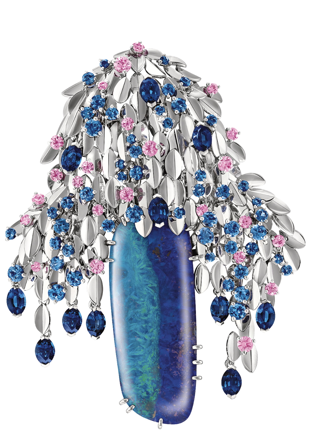 Van Cleef & Arpels, брошь Feuillage rêveur, Le Grand Tour, белое золото, опал, сапфиры