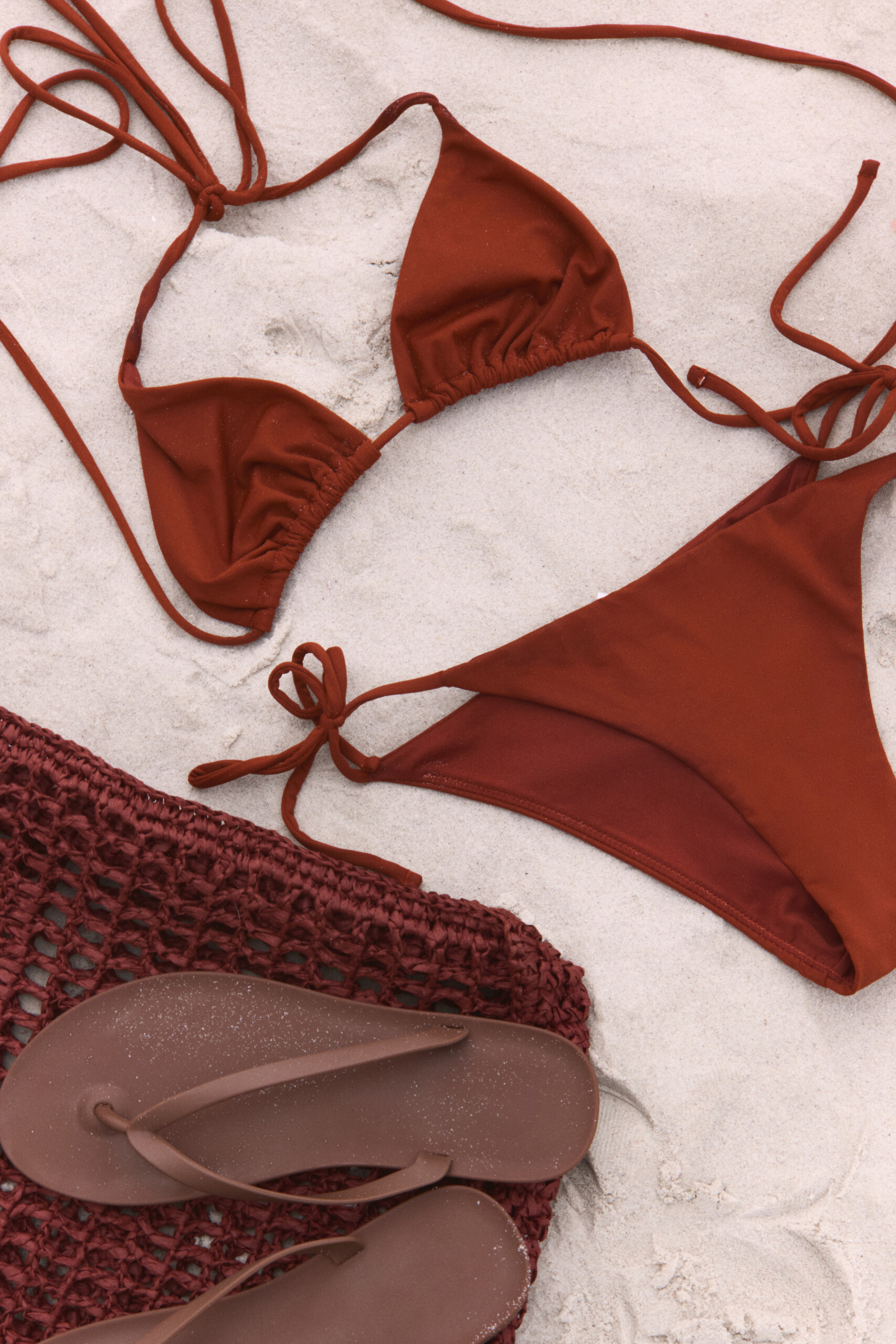 Капсула купальников Dune обновилась в новом сезоне. Палитру оттенков пополнили два актуальных цвета — трюфель и терракот — которые становятся еще насыщеннее в лучах палящего солнца. Среди новых моделей — топ с декоративной завязкой на груди, сплошной купальник с завязками по бокам, а также три модели купальных трусов с разной посадкой по фигуре. Купальники Dune выполнены из бифлекса. Они хорошо держат форму, быстро сохнут после купания и не выгорают на солнце.