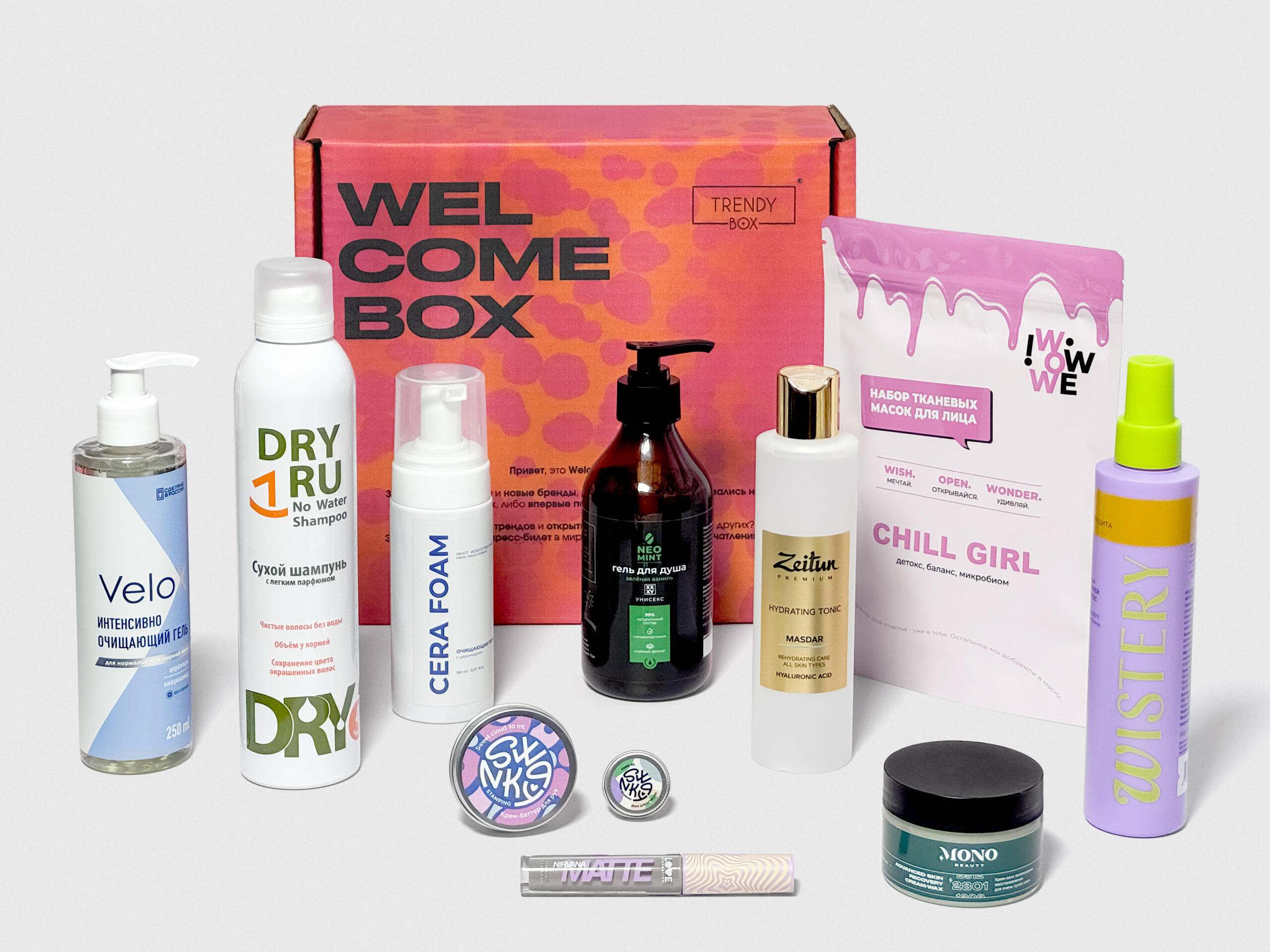 WELCOME BOX от Trendy Box — это бьюти-знакомство с новыми брендами и яркими новинками, собранными в формате полноценного ухода — от очищения до финальных акцентов в образе. В наборе пенка для умывания INVIT, тканевая маска IWOWWE, термозащитный крем-спрей для волос от WISTERY, парфюмированный гель для душа NEOMINT и другие средства.