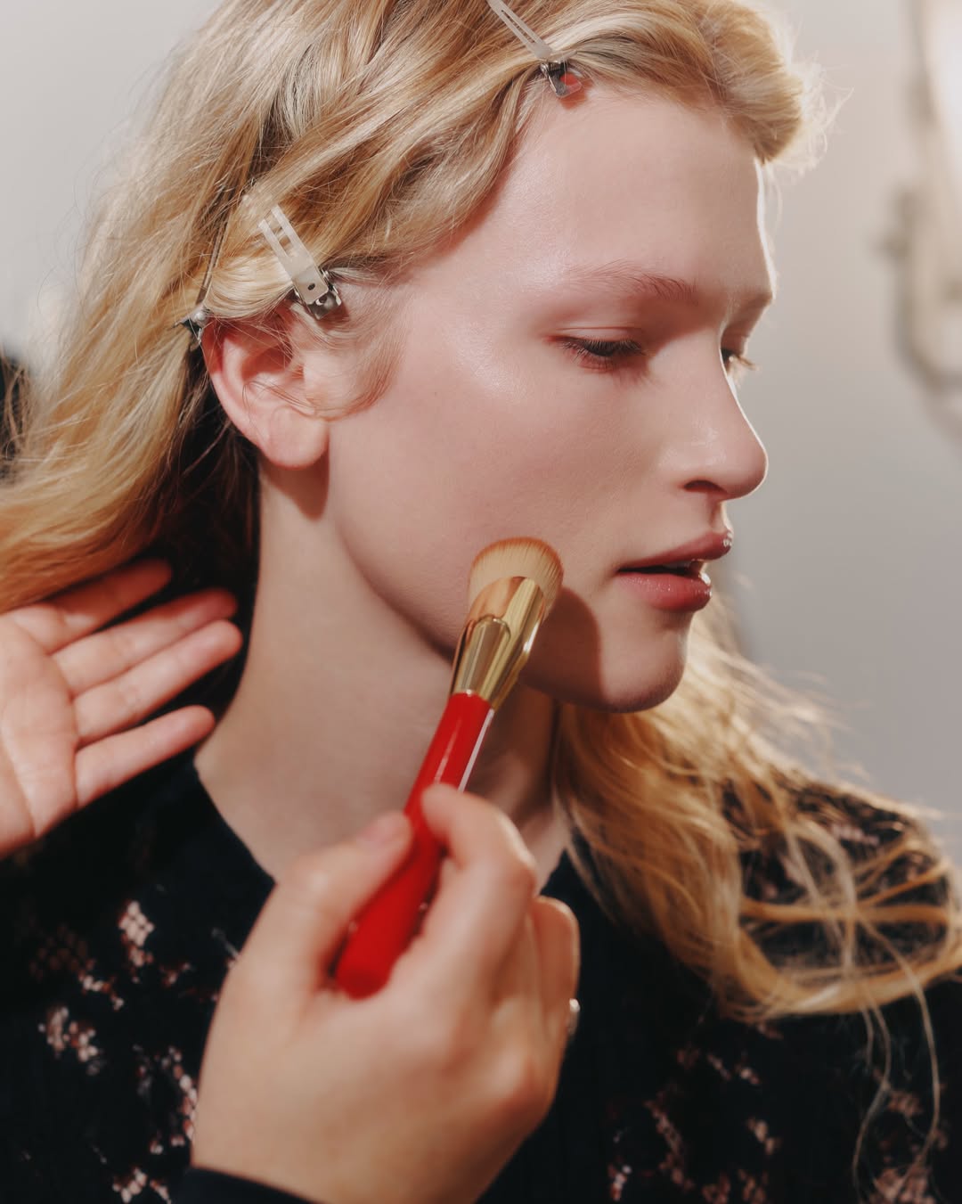 Несмотря на то, что весна уже на пороге, на показе Ralph Lauren все еще царит «морозный румянец»: ярко-розовые румяна покрывают почти всю область щек, образуя выразительную треугольную форму. Вся остальная часть макияжа остается максимально лёгкой и свежей — невесомый цвет на губах и мягкие, едва тронутые тушью глаза. Волосы моделей распущены в естественной укладке, а ногти — и это, кажется, становится новой тенденцией — совершенно натуральные.