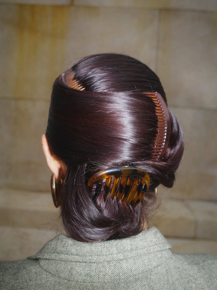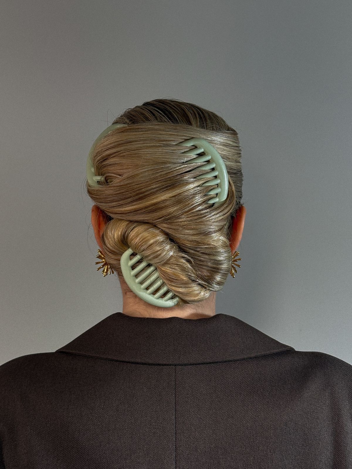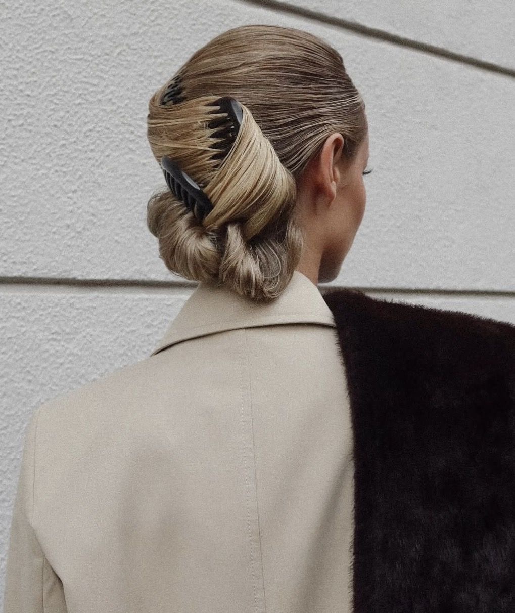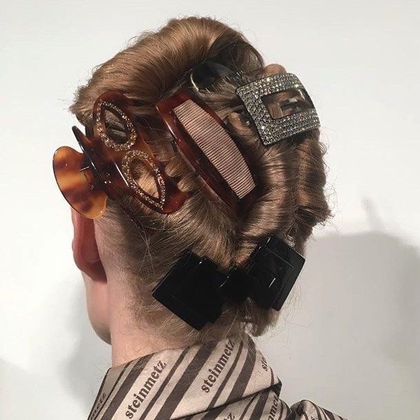 Также актуальны не только классические шпильки, но и крупные декоративные крабики, винтажные броши, заколки с цепочками, спадающие на шею, и даже живые цветы, вплетенные в конструкцию. Сам пучок может быть как идеально гладким, так и нарочито небрежным, но именно декор выходит на первый план.