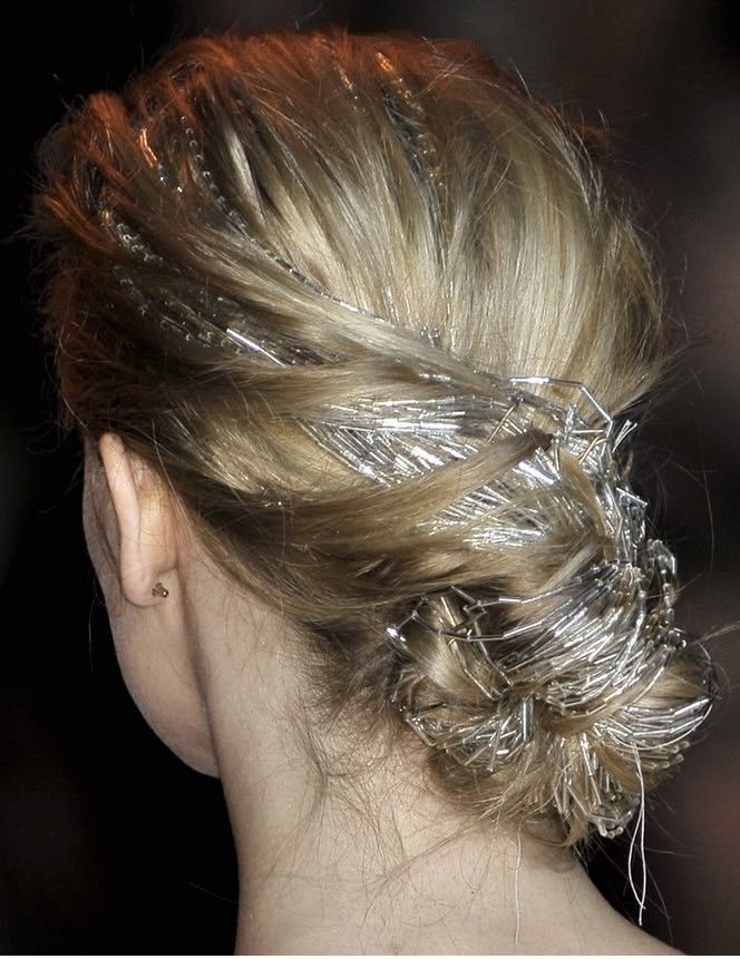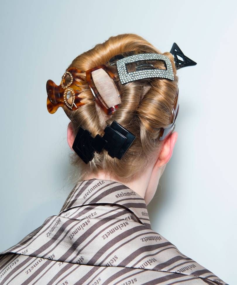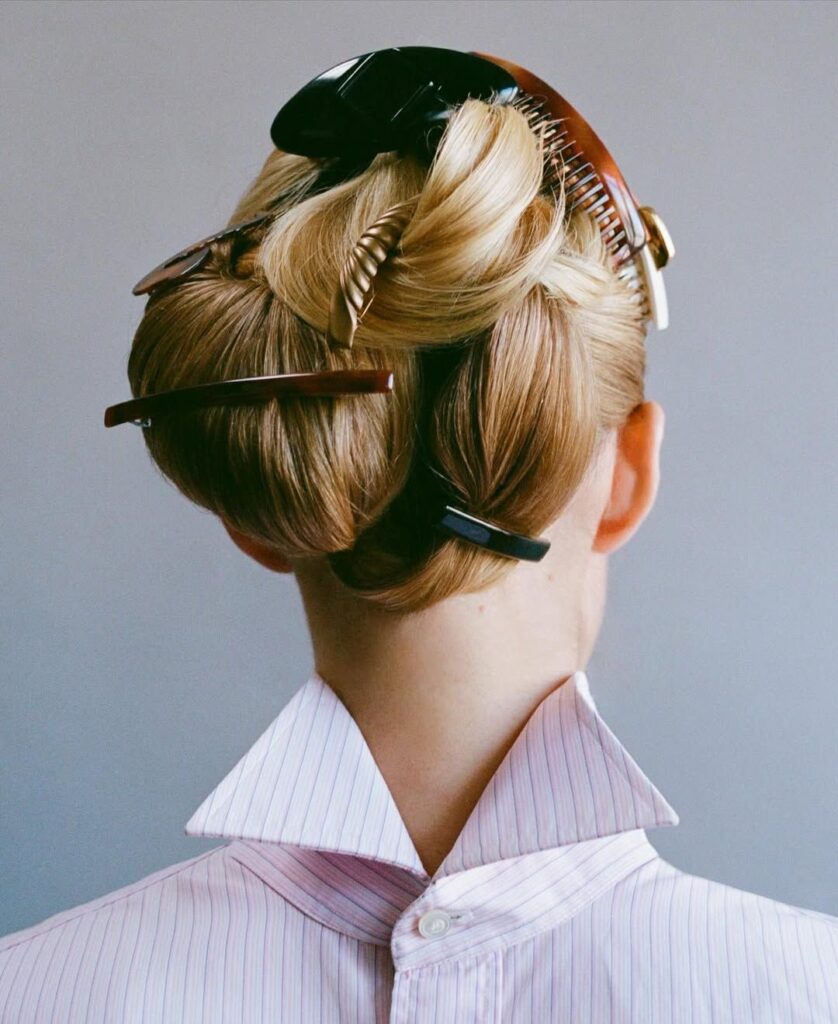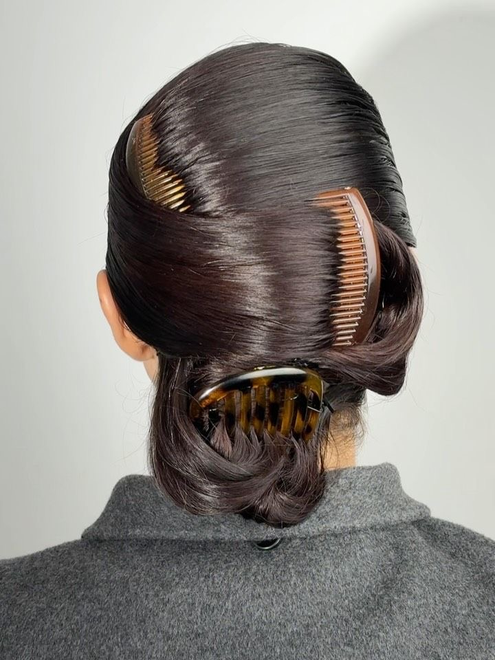 Также актуальны не только классические шпильки, но и крупные декоративные крабики, винтажные броши, заколки с цепочками, спадающие на шею, и даже живые цветы, вплетенные в конструкцию. Сам пучок может быть как идеально гладким, так и нарочито небрежным, но именно декор выходит на первый план.