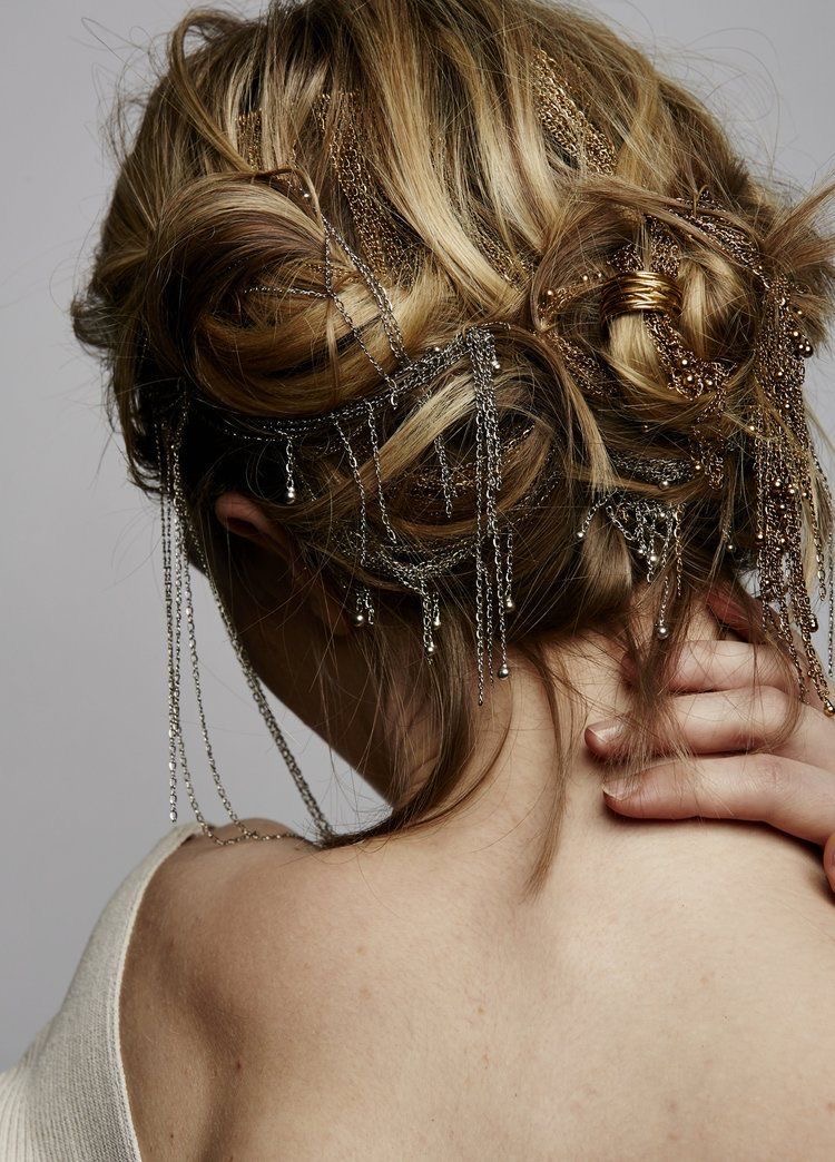 Главный принцип тренда — «чем больше, тем лучше». Лаконичные пучки уходят в прошлое, уступая место рассыпанным по прическе звездам, жемчужинам и кристаллам. Невеста может позволить себе миксовать металлы: золото соседствует с серебром, а матовый жемчуг — с сиянием страз.