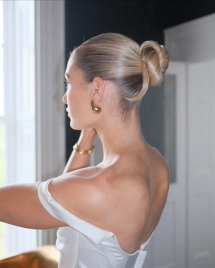 В случае с платьем с открытыми плечами наиболее удачным решением будет собрать волосы в гладкий пучок — он поможет подчеркнуть шею и плечи. Для дополнительного блеска можно обработать волосы спреем с шиммером.