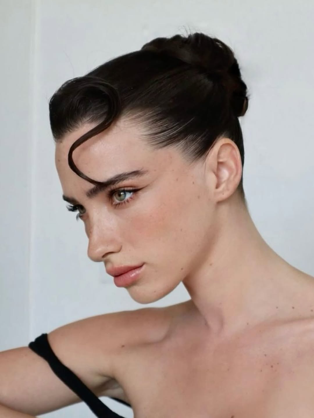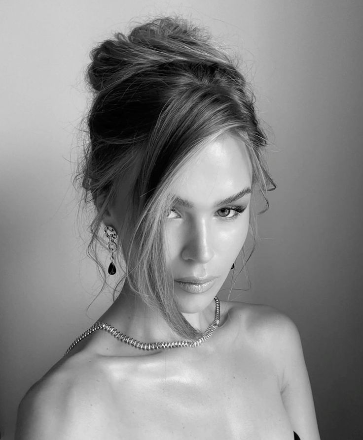 Мягкие локоны у лица смягчают строгость высокой прически и добавляют романтичности, при этом все также оставляя акцент на плечах и ключицах. Главное — сохранить гладкость свободных прядей у лица с помощью воска для волос или спрея сильной фиксации. Излишняя пушистость будет выглядеть неопрятно.