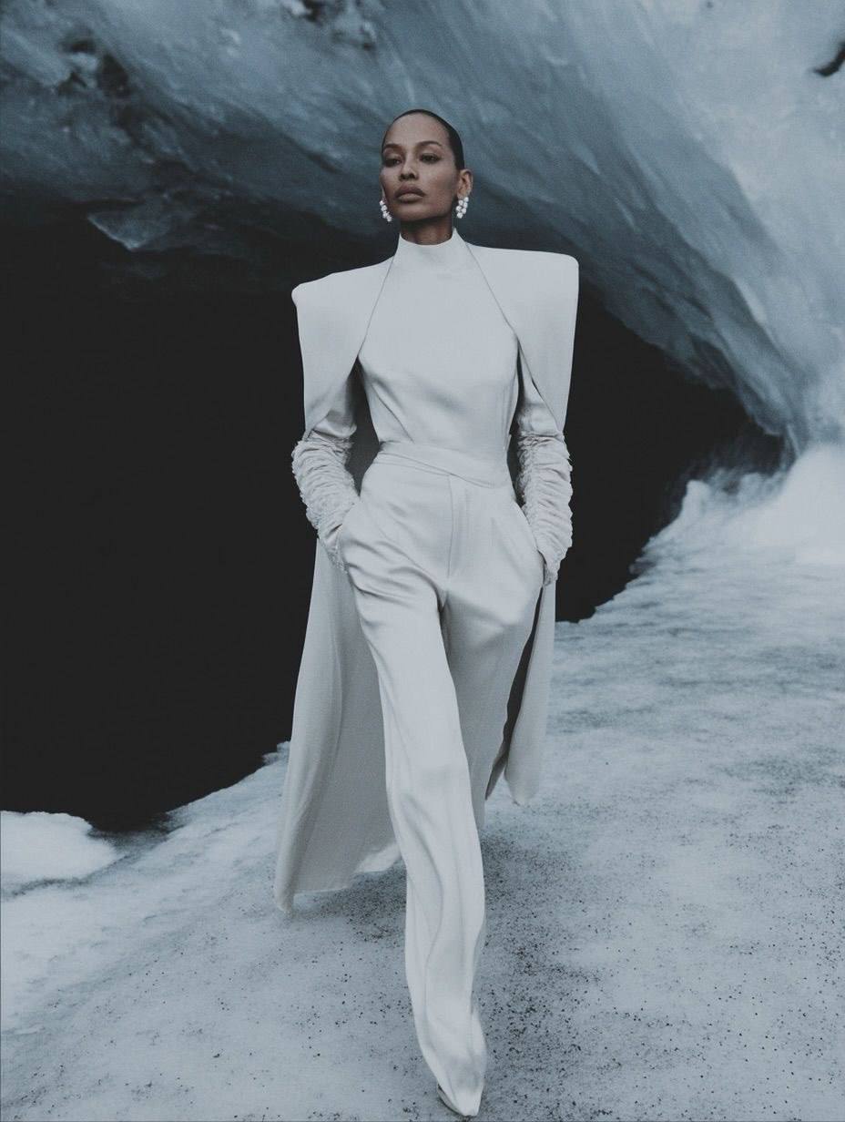 Лаконичный силуэт и среднее декольте легко перегрузить чересчур нарядной прической. Это ошибка. Следует сделать выбор в пользу прямых прядей у лица — эти линии будто повторяют движение кейпа. Такая челка, хоть и имеет отсылку к образам 90-х, все же имеет новое прочтение и определенно притягивает внимание.