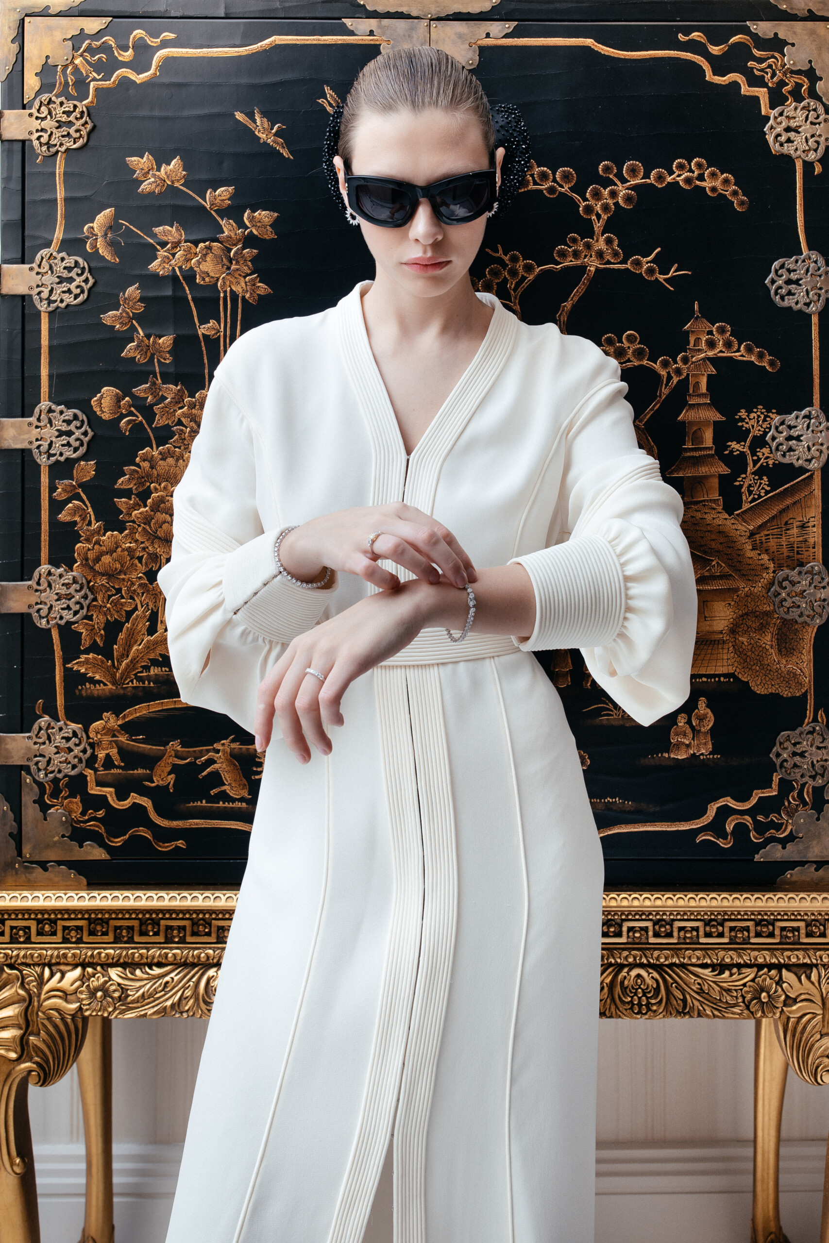 Платье Edem Couture, очки Blumarine, бант на заколке Panfil, cерьги, браслеты и кольца Parure Atelier