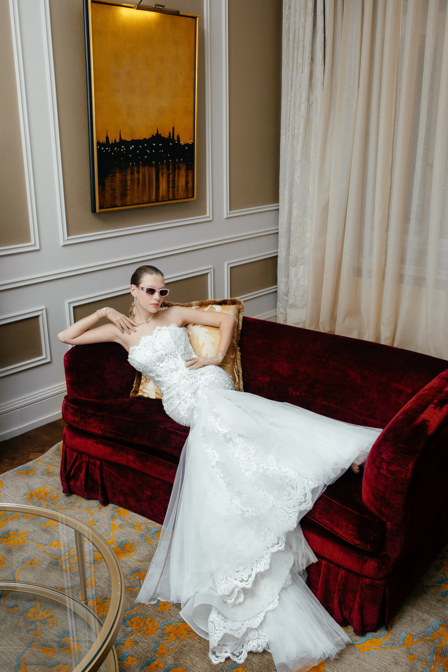 Платье Speranza Couture, Wedding Rooms, перчатки Glove Me, очки Blumarine, серьги и кольцо Bendes