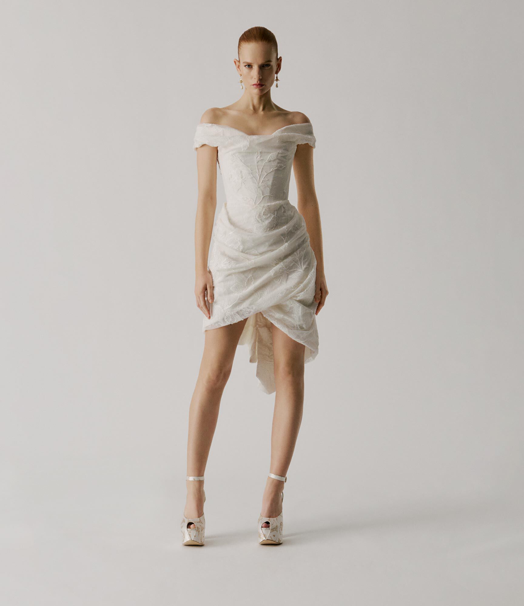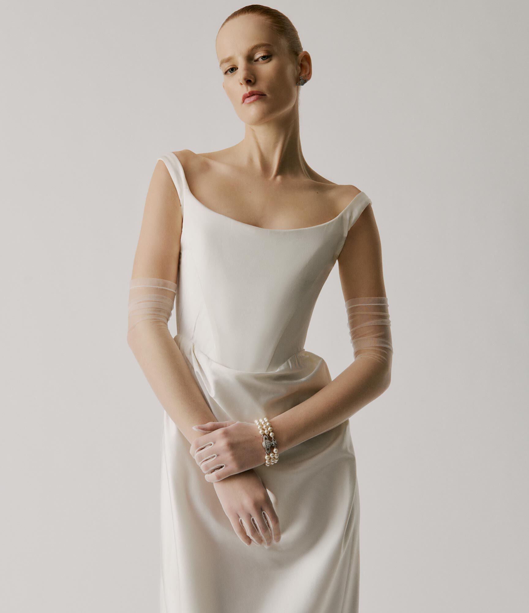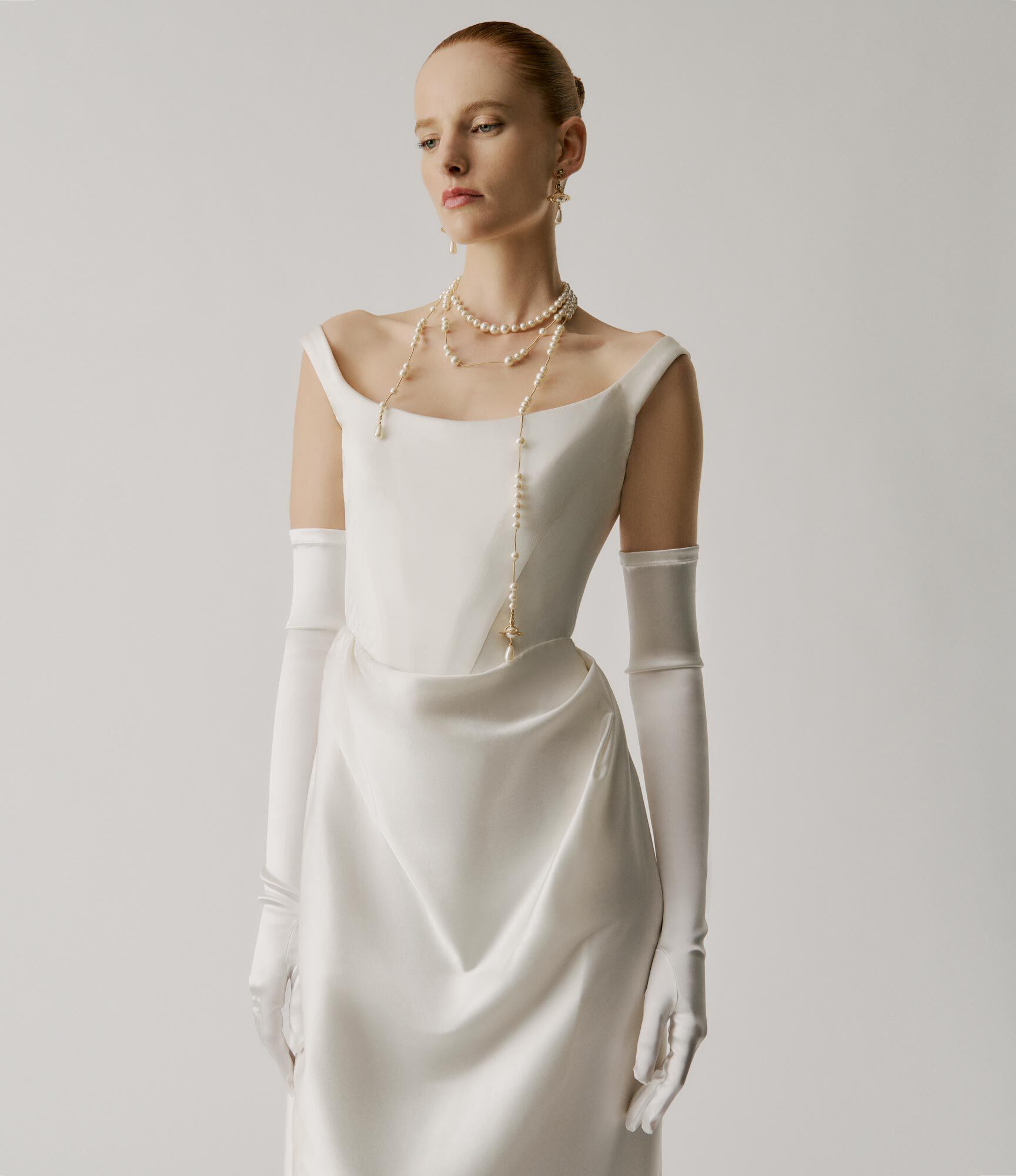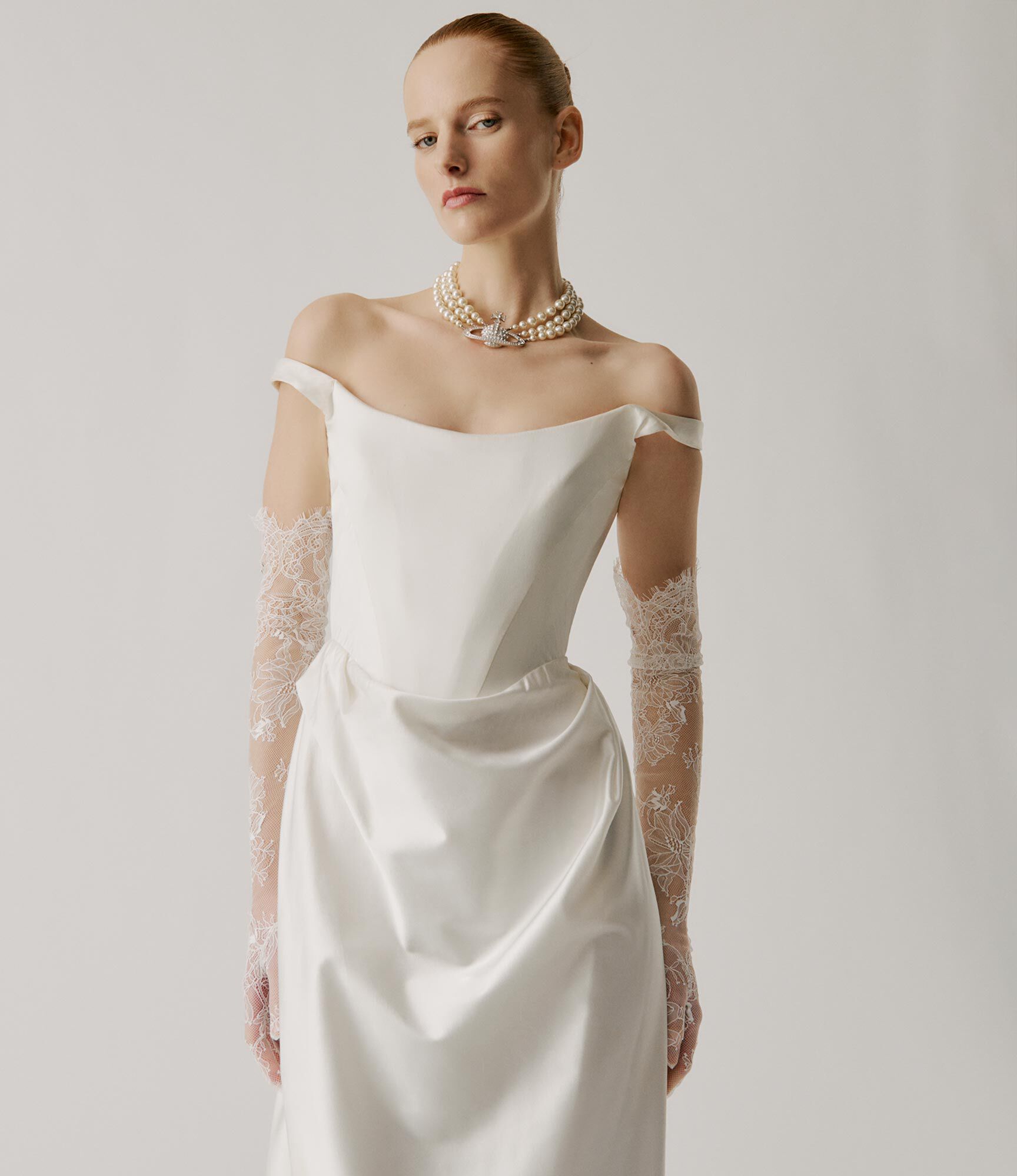Модный Дом Vivienne Westwood представил новую коллекцию свадебных платьев. В ней доступны сложные силуэты и корсетные изделия, преображающие фигуру. Также среди новинок много аксессуаров: можно найти драматичную фату с кружевом, очаровательные мини-сумки, знаковые жемчужные чокеры с логотипом бренда и много вариантов оперных перчаток.