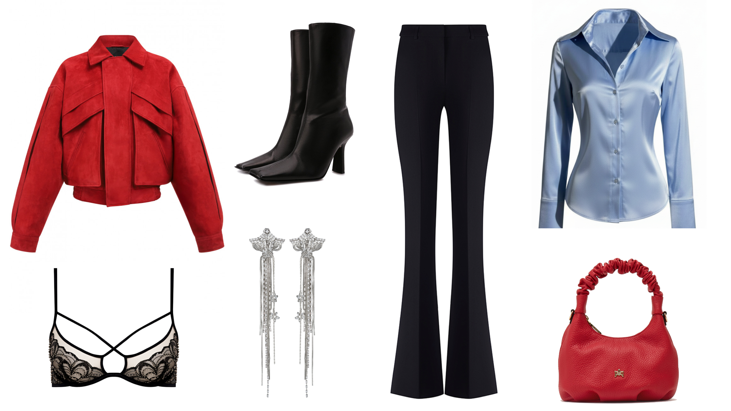 Подчеркнет вашу силу и характер, но при этом оставит простор для фантазии. Строгие брюки клеш максимальной длины в сочетании с ботильонами на каблуке визуально удлинят ноги и сделают их более стройными. Шелковая приталенная блуза нежного оттенка и крупные серьги-цепи подчеркнут женственность. Ансамбль завершают алый замшевый бомбер и миниатюрная сумочка — яркие акценты, выдержанные в единой цветовой гамме.