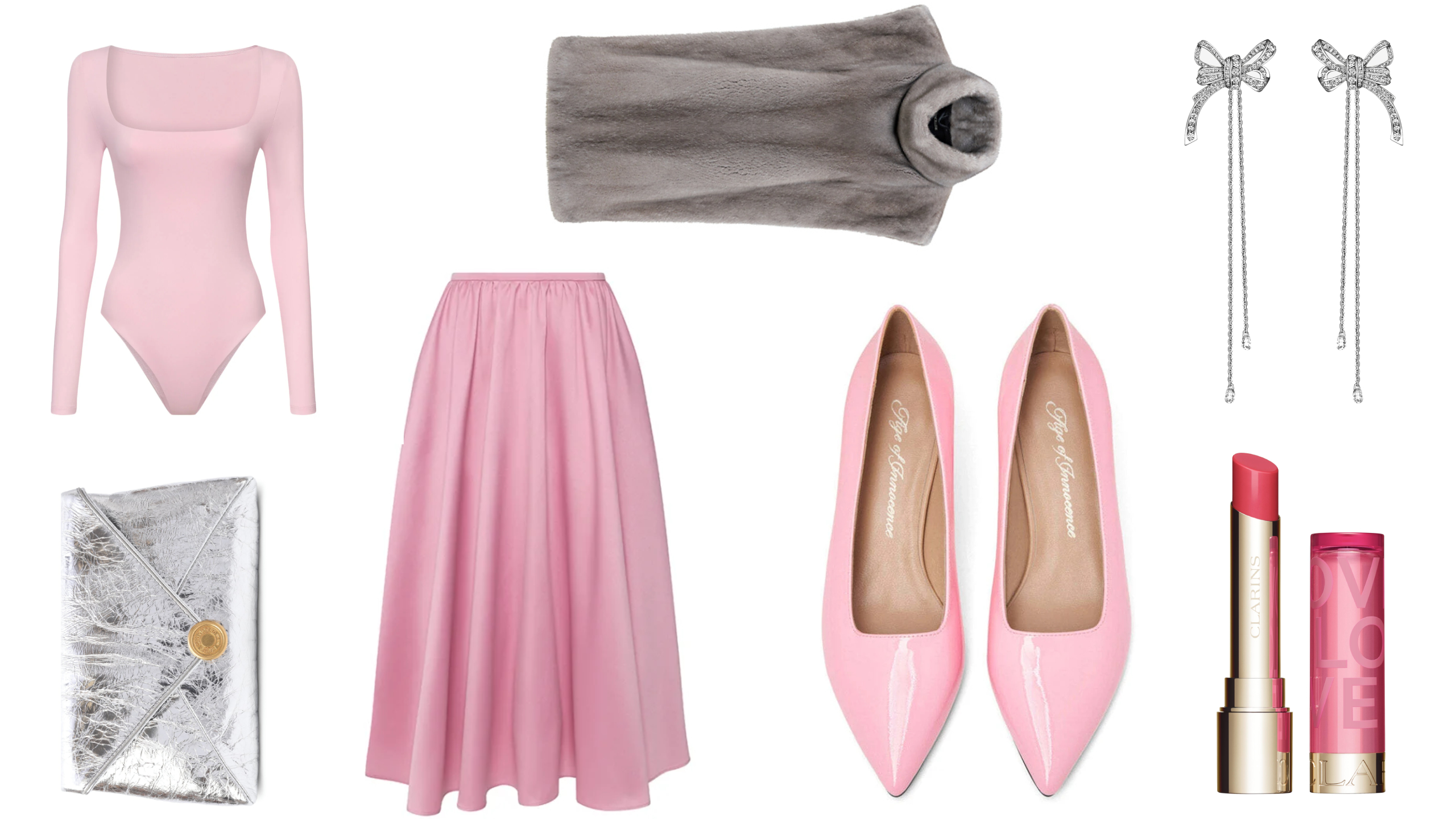 Для создания трогательного настроения выбирайте нежно-розовую палитру. Боди с глубоким декольте и юбка-солнце подчеркнут талию, лаковые лодочки добавят игривости. За серьезность намерений в этом образе отвечают элегантная манишка из норки и классические серьги с бриллиантами.