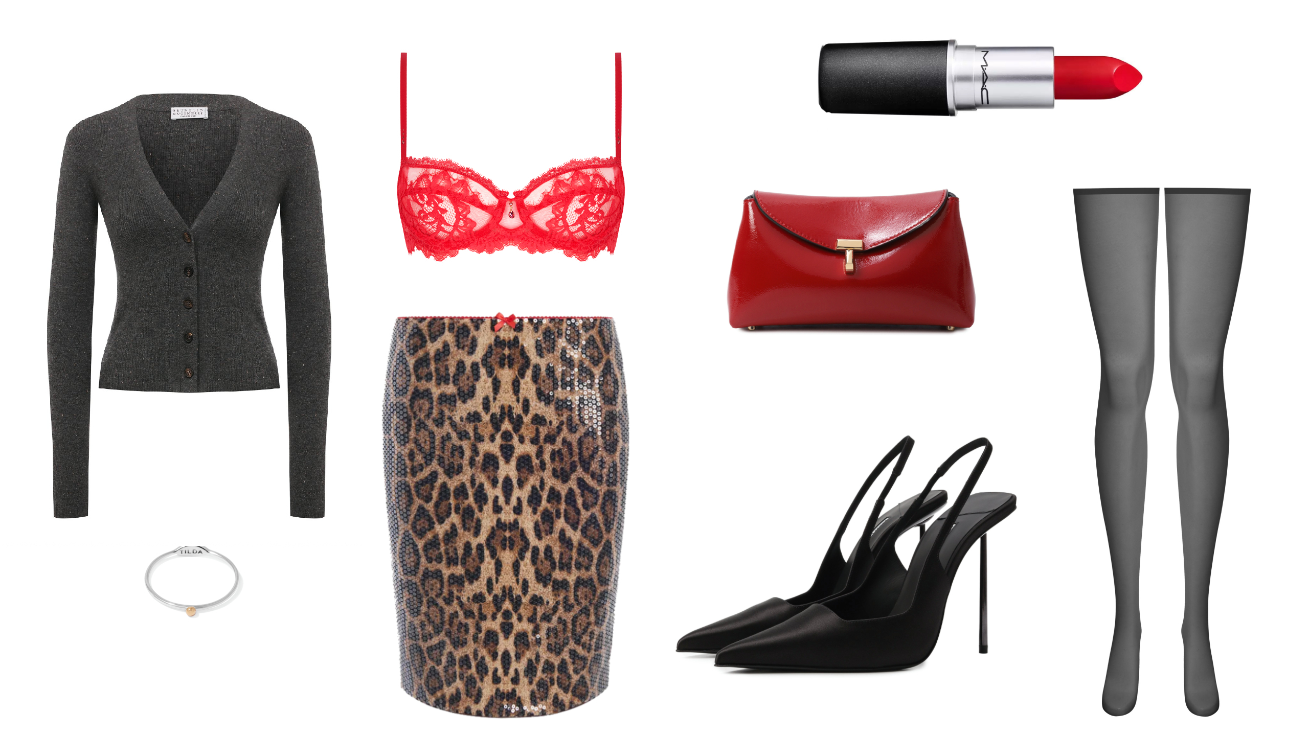 Прекрасная идея для тех, кто хочет запомниться в этот день не только своему возлюбленному, но и всем окружающим. Юбка с пайетками и анималистичным принтом хорошо сбалансирована лаконичным серым кардиганом. Дьявол кроется в деталях: едва заметный кружевной бра, стильное лаконичное украшение и лаковый клатч завершают вечерний образ. Такой аутфит отлично подойдет для романтического ужина в ресторане.