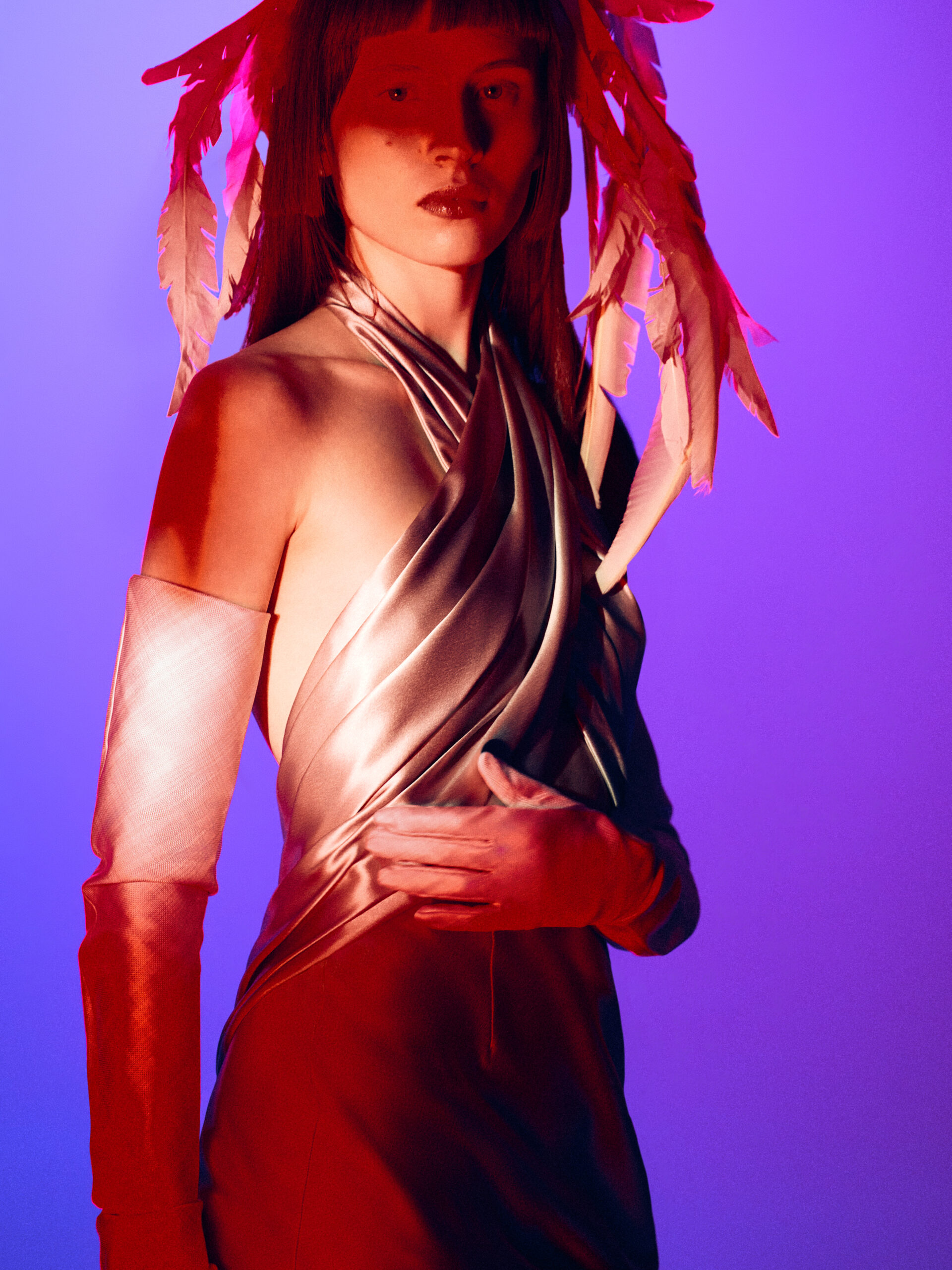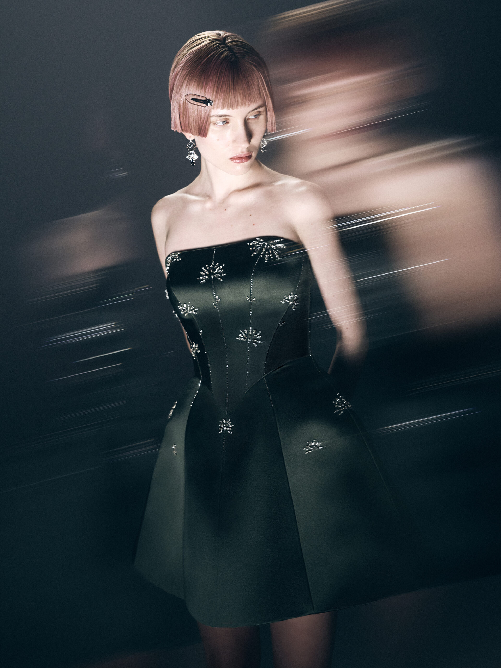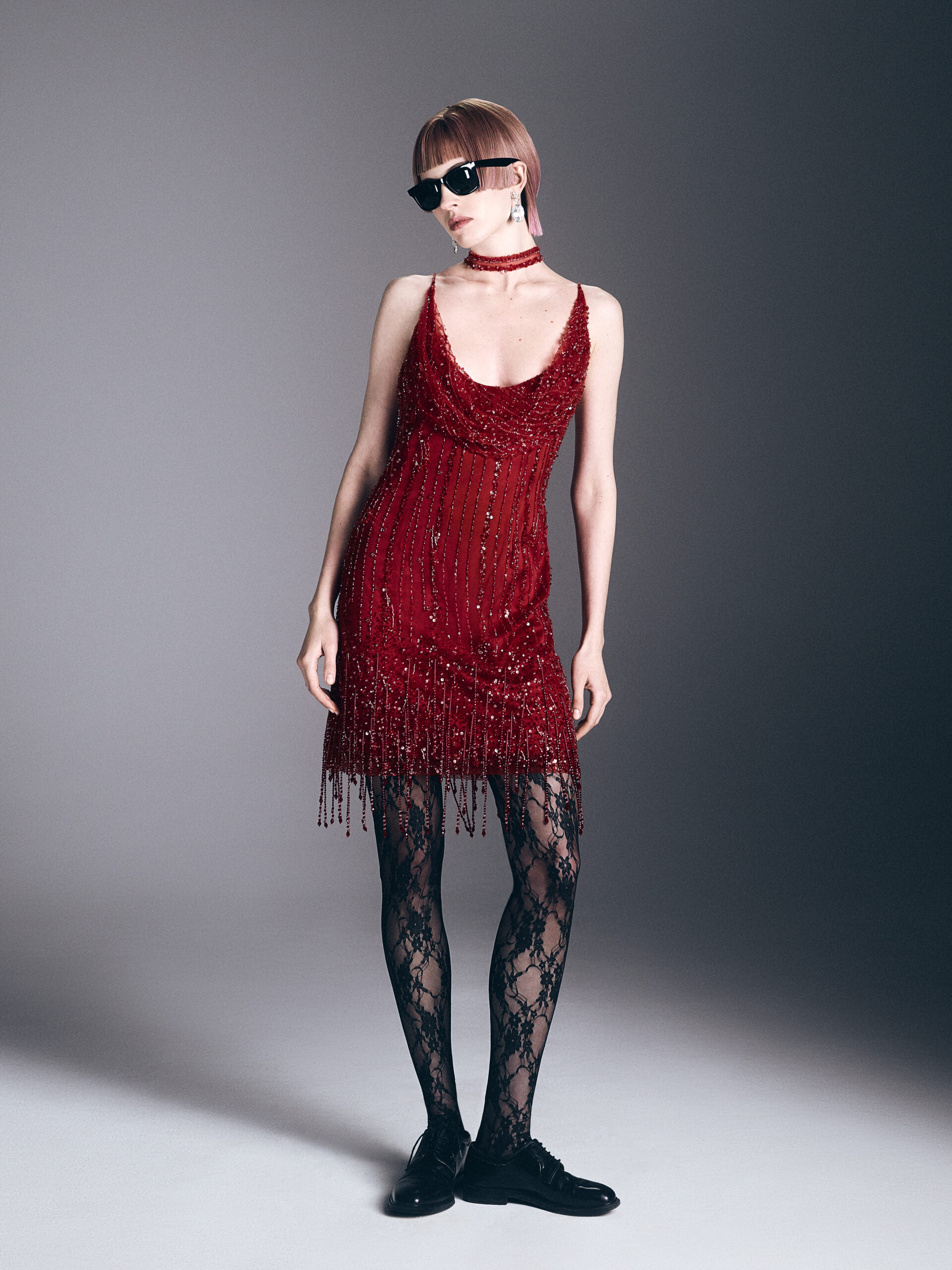 Главным визуальным языком коллекции стала игра форм и разнообразие силуэтов. Дизайнеры Дома предлагают взглянуть на вечернюю моду через призму контрастов. Например, красное мини-платье, расшитое кисточками из японского бисера, представлено с мужскими ботинками — как символ внутренней борьбы характеров и силы выбирать собственную идентичность.