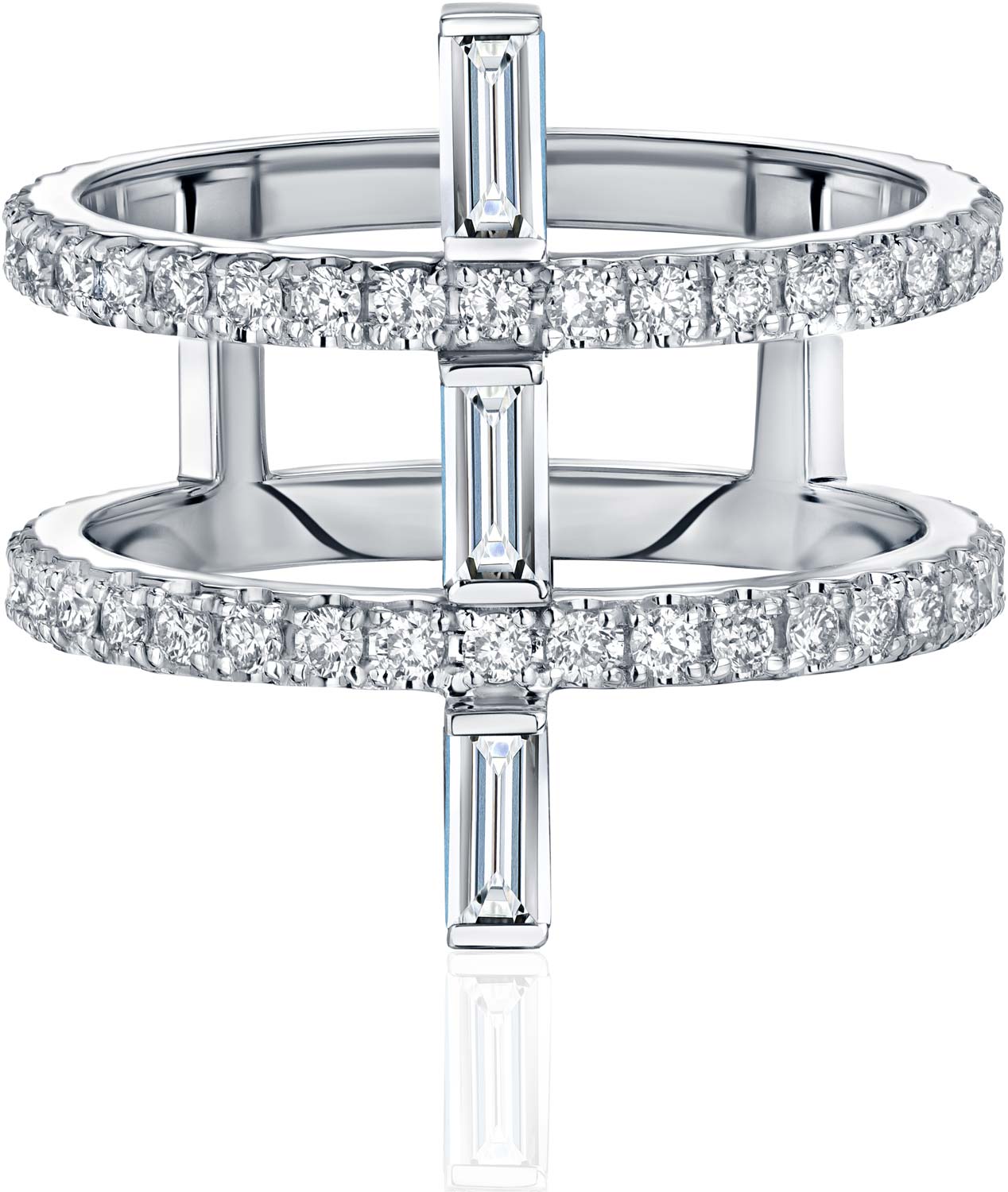 Поэтому центральная идея — возможность «собирать» свои украшения, нанизывая кольца одно на другое и поворачивая под новым углом, — окажется им максимально близка. Как и завораживающее сияние бриллиантов архитектурно четкой огранки «багет».