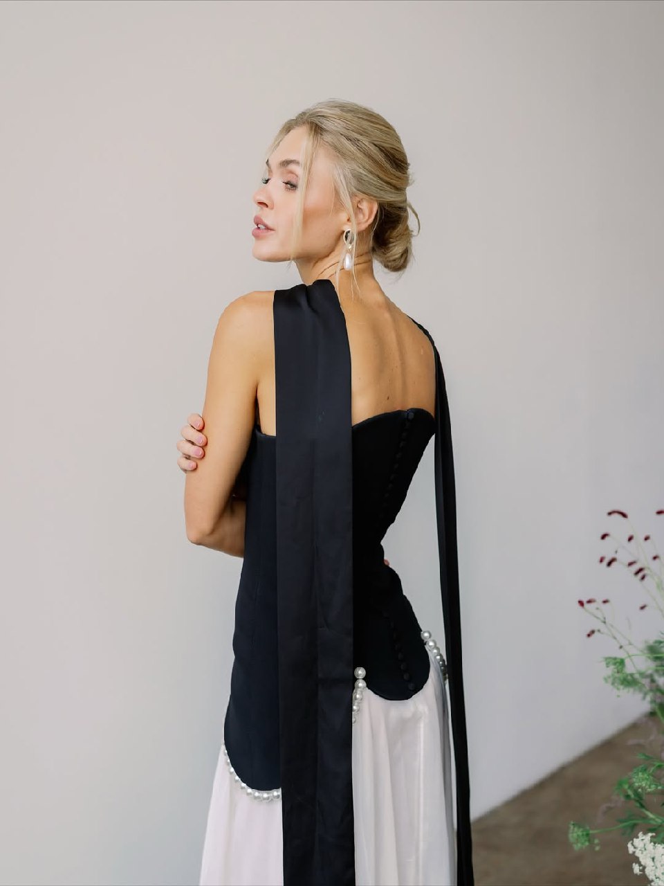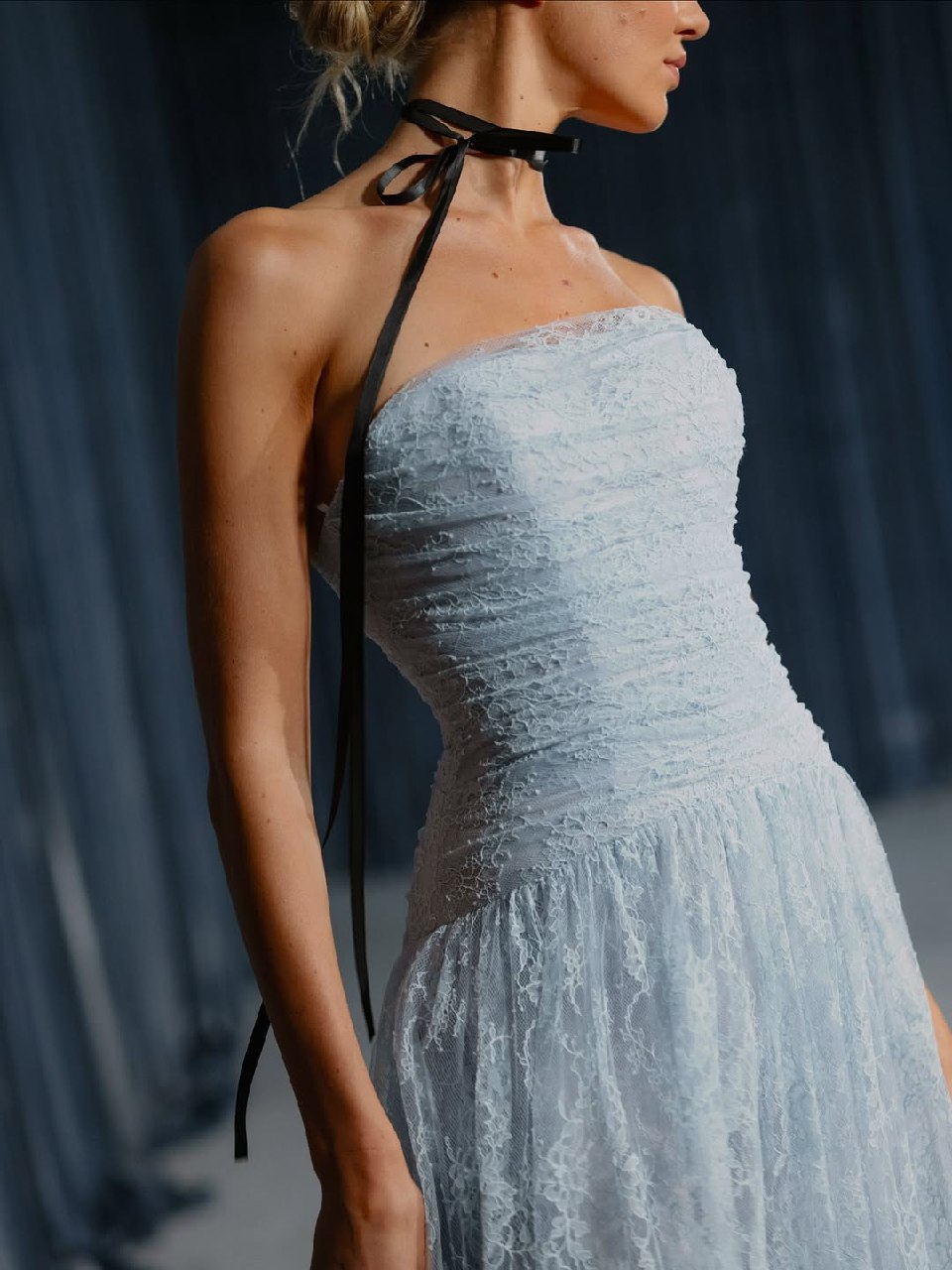 Многие дизайнеры представили в своих коллекциях изящные ленты и шарфы. Тонкая шелковая лента, завязанная на шее изящным бантом, или широкая летящая атласная полоса — этот прием мгновенно фокусирует внимание на декольте и линии плеч. Особенно эффектно такая деталь смотрится с корсетом или верхом-бандо. Лента может быть белоснежной в тон платью, или, напротив, контрастной — черной или цветной. Особенно удачно аксессуар смотрится с собранными волосами.