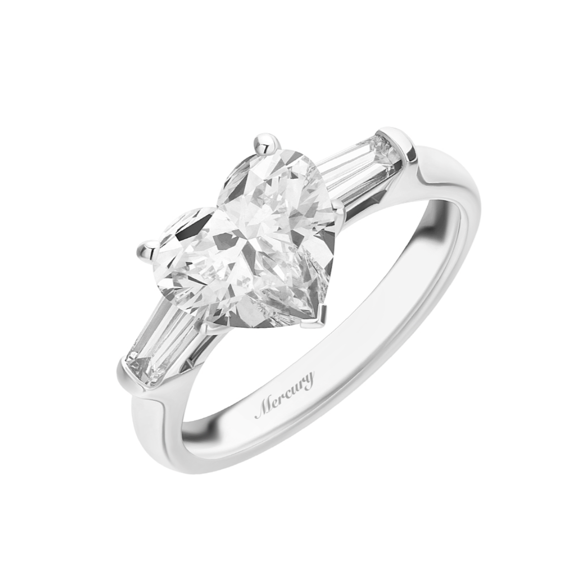 Сегодня в центре внимания образец изысканной лаконичности и романтики — помолвочное кольцо Mercury из белого золота. Его центральный элемент — сияющий бриллиант в редкой огранке «сердце» — трогательное признание, заключенное в драгоценную оправу. По бокам его бережно «поддерживают» два строгих багета, четкие линии которых оттеняют мягкие контуры центрального камня, создавая идеальный баланс между эмоцией и элегантностью.