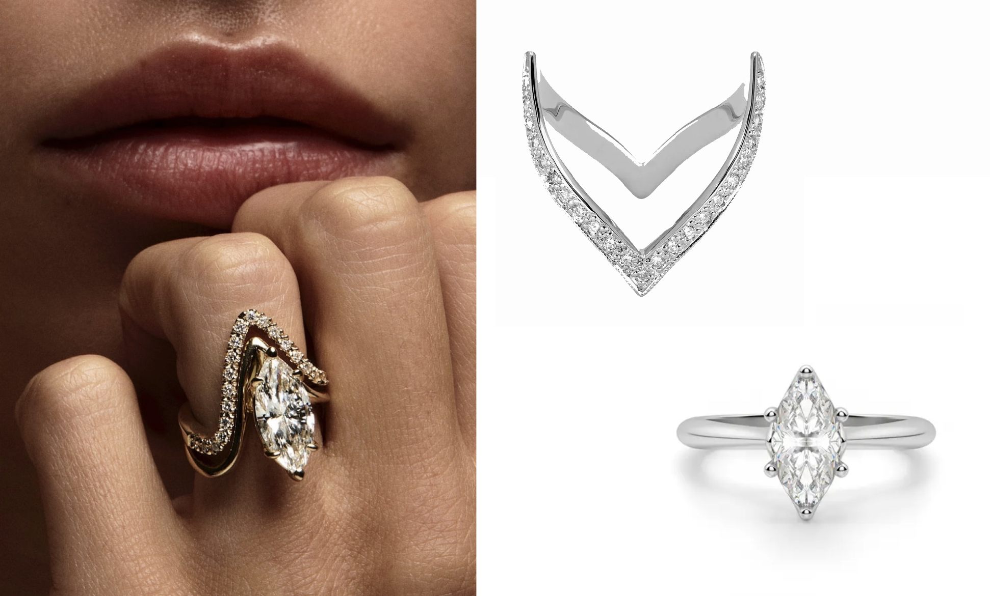 Бриллиант «маркиз» можно смело назвать одной из самых нетривиальных огранок этого и следующего года. Он смотрится по-настоящему необычно и эффектно, но подобрать под него подходяющее по форме обручальное кольцо будет непросто. Ищите в пару к такому бриллианту кольцо с выемкой в форме «галочки». Лучше сделать его на заказ, заранее согласовав эскиз с ювелиром. Кольца будут идеально гармонировать друг с другом, в сочетании они образуют единое целое.