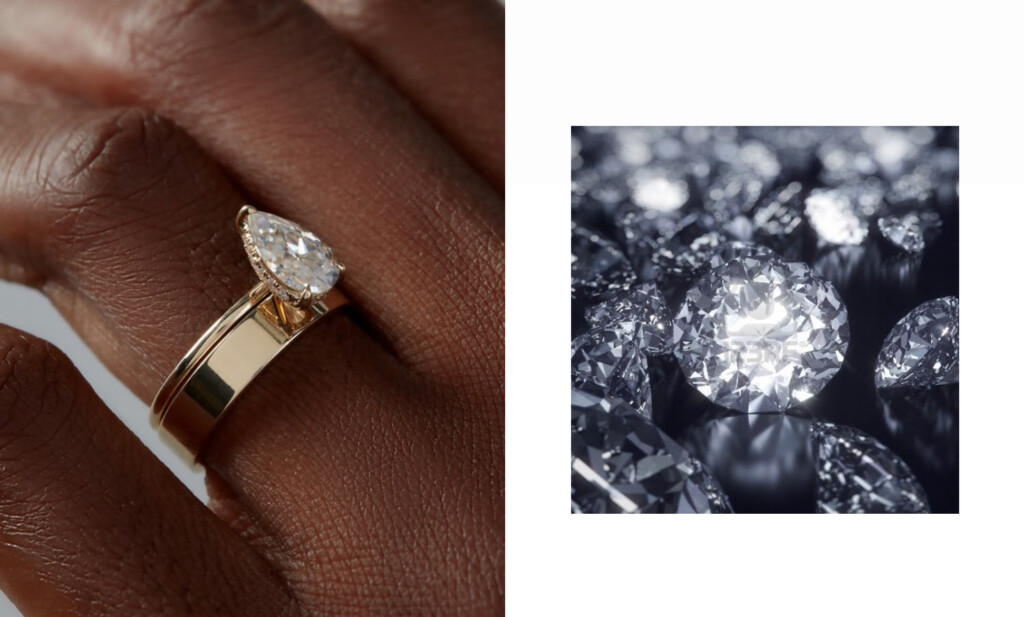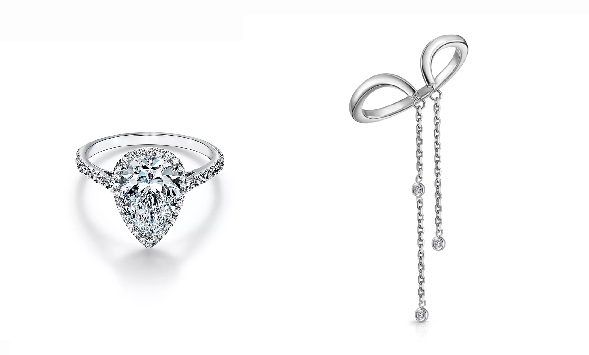 Бриллинт «груша» — большой тренд 2023 года, но в сочетании с необычным обручальным кольцом он будет смотреться по-настоящему футуристично. Кольцо обтекаемой формы с цепочками-кисточками и помолвочное кольцо (его необходимо повернуть узкой частью вниз) будут выглядеть невероятно стильно.