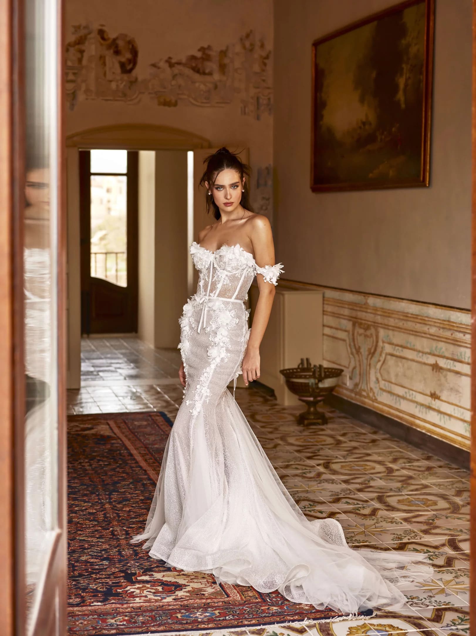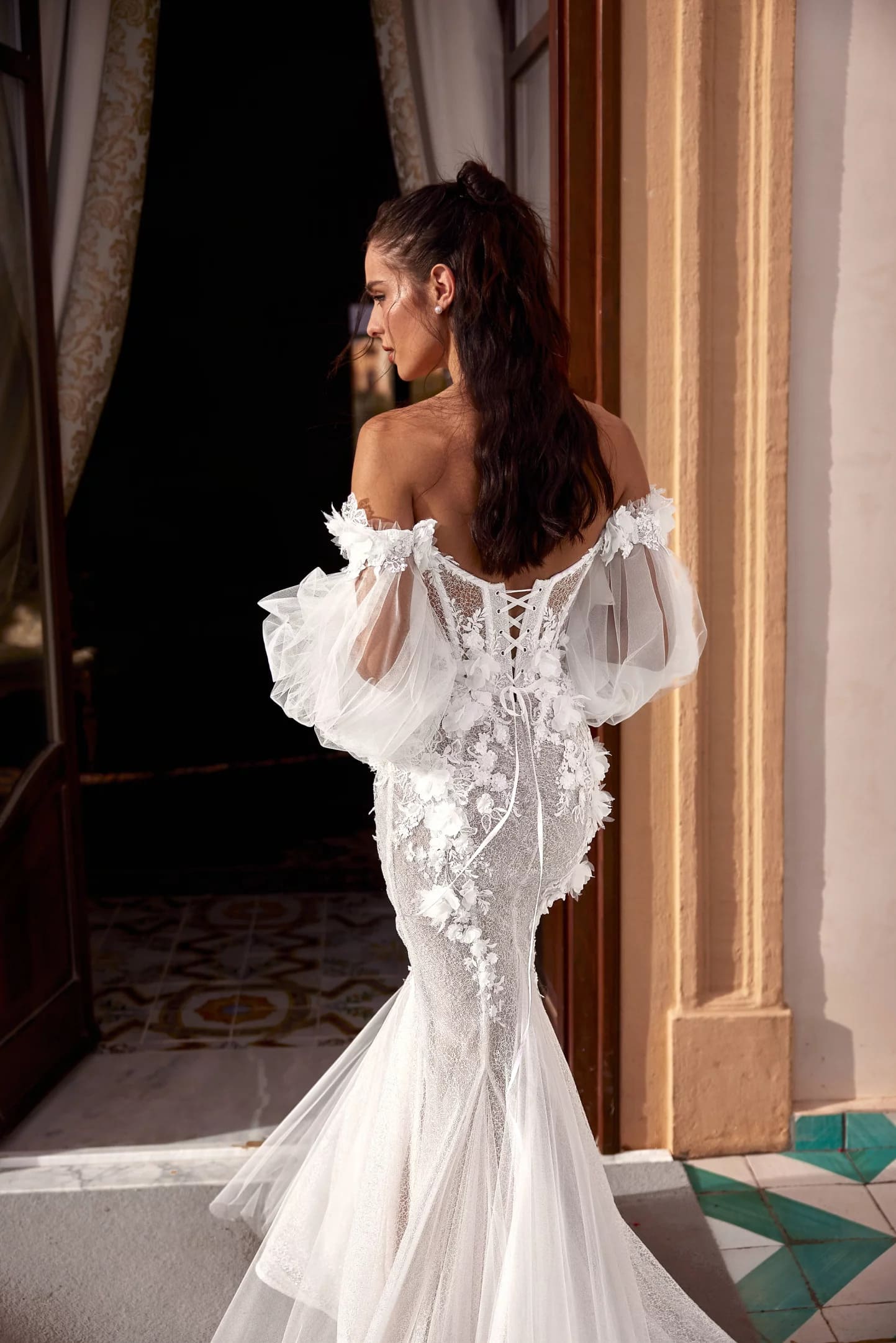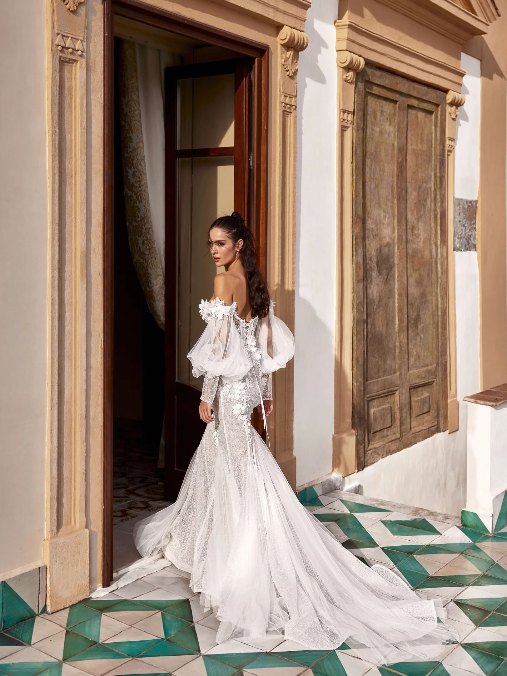 Свадебное макси фасона «русалка» удачно подчеркивает талию и рисует красивый силуэт с помощью полупрозрачного корсета. Наряд щедро усыпан объемными цветами и дополнен верхним слоем из мелкого кружева. Образ дополняют съемные объемные рукава из многослойного шифона. Изделие представлено в двух оттенках — пудровом и молочном. Стоимость платья составляет 115 500 рублей, оно доступно для примерки и покупки в свадебном салоне Kuraje.