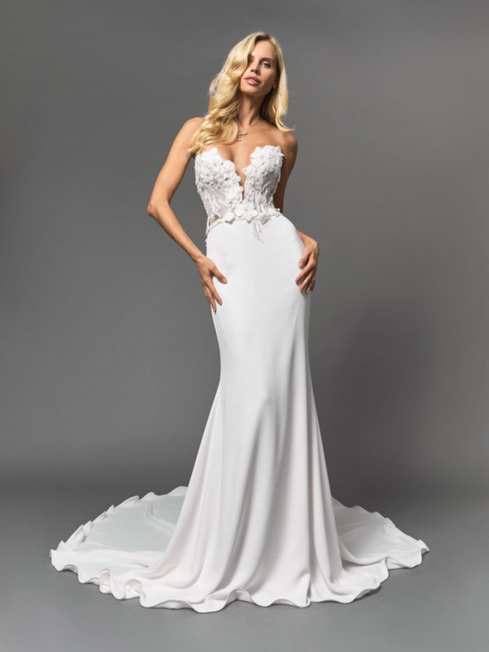 В противовес богато декорированному верху выступает лаконичная юбка из благородного струящегося шелка. Ее чистые линии подчеркивают силуэт и переходят в эффектный шлейф, делающий образ по-настоящему торжественным и величественным. Платье сейчас доступно с большой скидкой в бутике Blanche Bridal, его стоимость составляет 320 000 рублей.