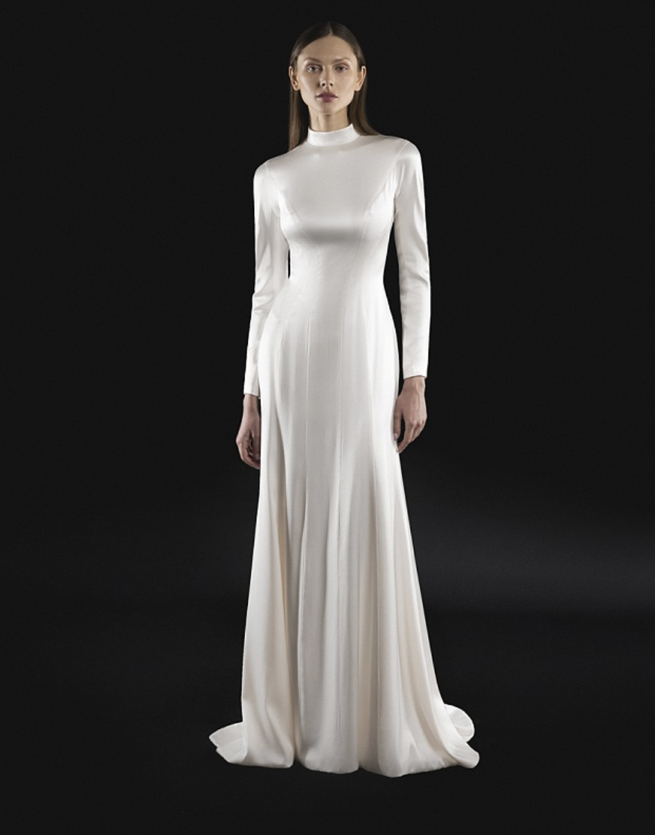 Модная тенденция сезона — закрытые лаконичные платья в пол. Цвет — белый, но не стерильный, а с оттенком слоновой кости или экрю. Задача этого образа — вызвать восхищения у гостей и подготовить их к основному выходу.