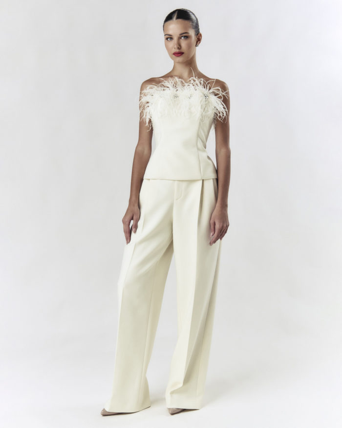 Выбирайте гладкие фактуры, плотный хлопок, легкий лен или атлас. Костюм цвета шампань или сдержанного кремового оттенка смотрится в разы интереснее кричащей белизны. Главные аксессуары — минималистичные серьги или цепочка и то самое помолвочное кольцо.